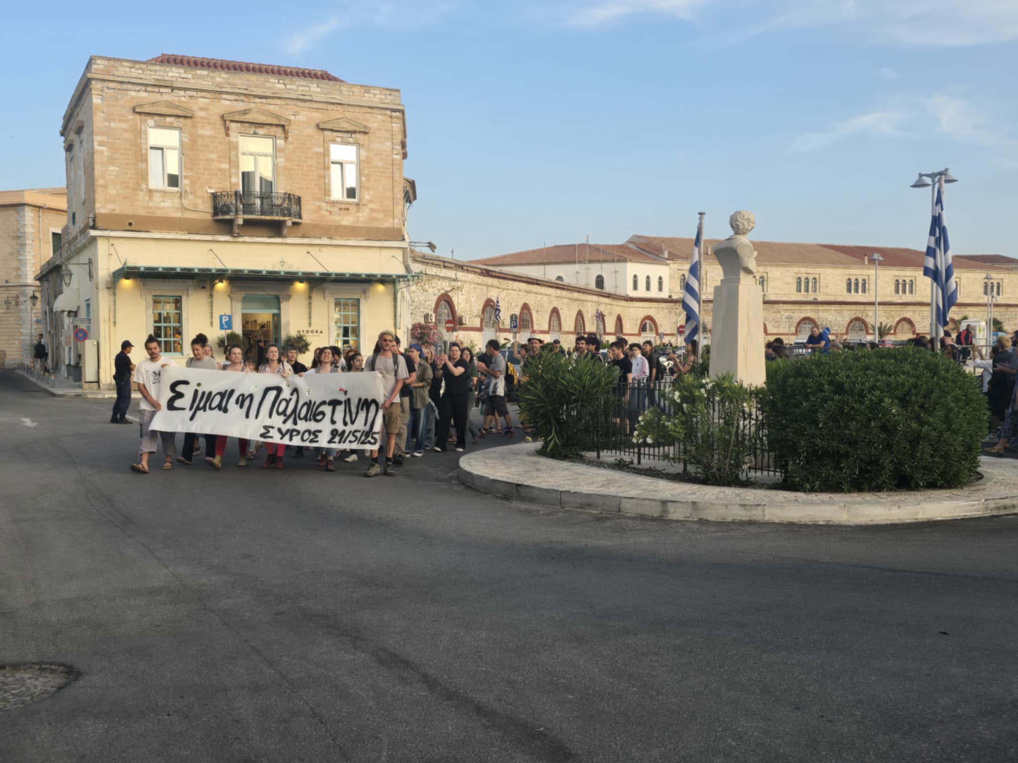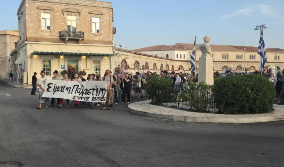 Συγκέντρωση αλληλεγγύης στον Παλαιστινιακό λαό, πραγματοποιήθηκε σήμερα το απόγευμα στη πλατεία Μιαούλη και η οποία κορυφώθηκε με πορεία στο κέντρο της Ερμούπολης.
