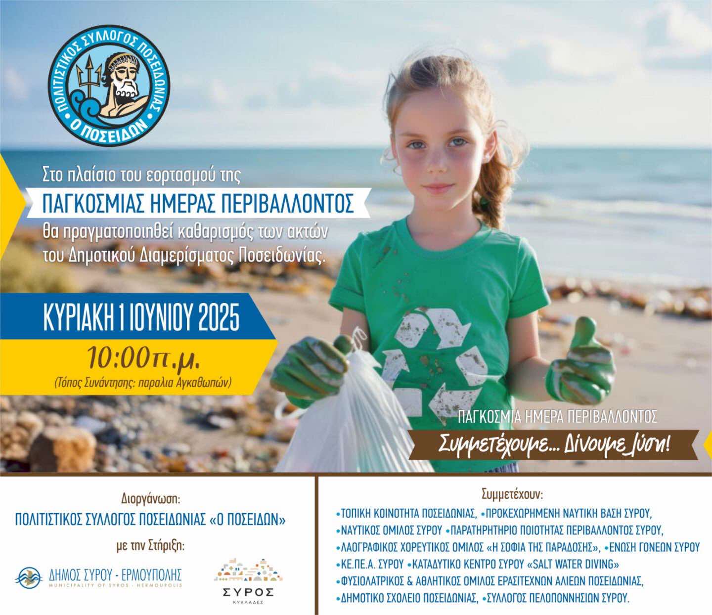 Πρόσκληση στον καθαρισμό των ακτών του Δημοτικού Διαμερίσματος Ποσειδωνίας, που διοργανώνει ο Σύλλογος της περιοχής "Ποσειδών" με την υποστήριξη του Δήμου Σύρου-Ερμούπολης, και τη συμμετοχή αρκετών φορέων, για να τιμήσουμε την Παγκόσμια Ημέρα Περιβάλλοντος.