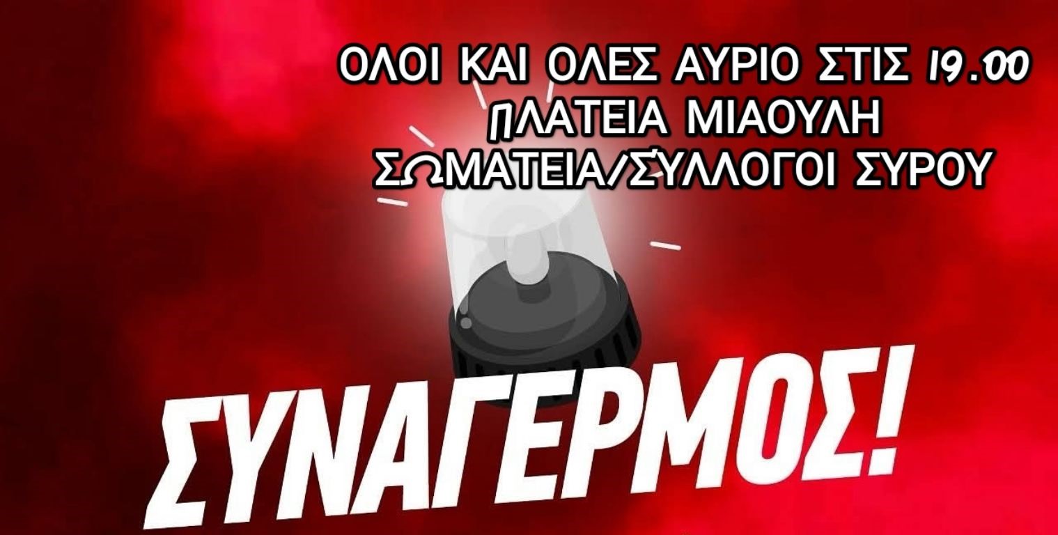 Κάλεσμα αλληλεγγύης στους λαούς της Μέσης Ανατολή, αλλά και με αίτημα την άμεση απεμπλοκή της Ελλάδας από τον πόλεμο, απευθύνουν μέσω συγκέντρωσης που θα πραγματοποιήσουν αύριο, Τρίτη, στις 7 το απόγευμα, Σωματεία και Σύλλογοι της Σύρου.