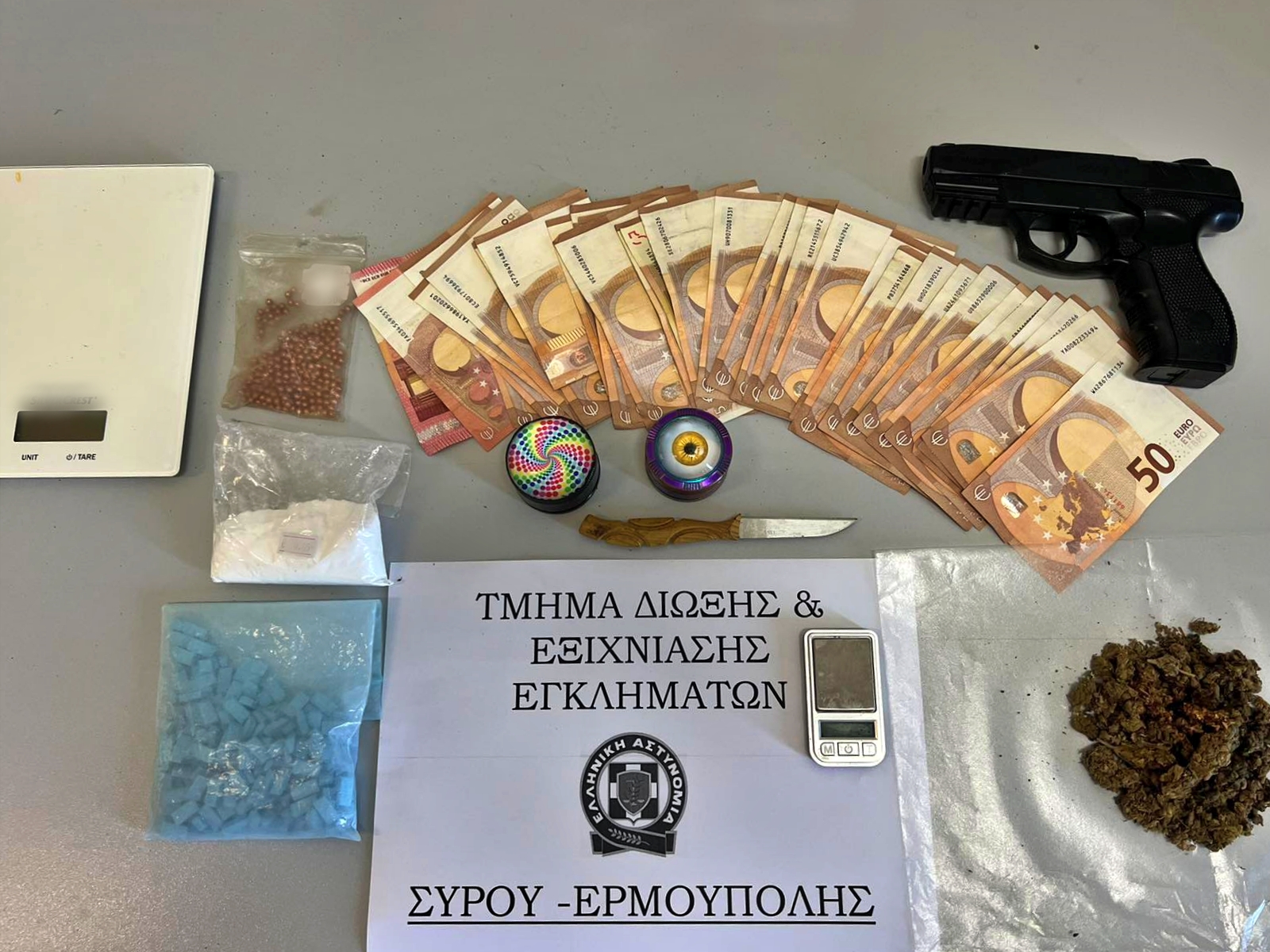 Συνελήφθησαν προχθές από αστυνομικούς του Τμήματος Δίωξης και Εξιχνίασης Εγκλημάτων Σύρου - Ερμούπολης, τρεις ημεδαποί ηλικίας 19, 24 και 38 ετών και συγκεκριμένα δύο άνδρες και μία γυναίκα, σε βάρος των οποίων σχηματίστηκε δικογραφία για κατοχή - διακίνηση ναρκωτικών ουσιών κατά συναυτουργία και οπλοκατοχή.