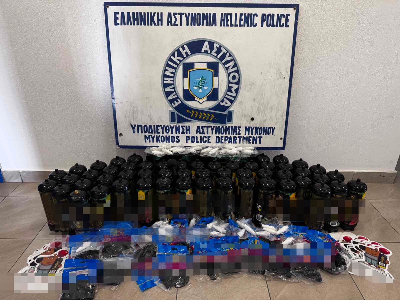 Συνελήφθησαν χθες από αστυνομικούς της Υποδιεύθυνσης Αστυνομίας Μυκόνου, τρεις αλλοδαποί ηλικίας 21, 23 και 24 ετών, οι οποίοι κατείχαν με σκοπό την εμπορεία συσκευασίες με "αέριο γέλιου".