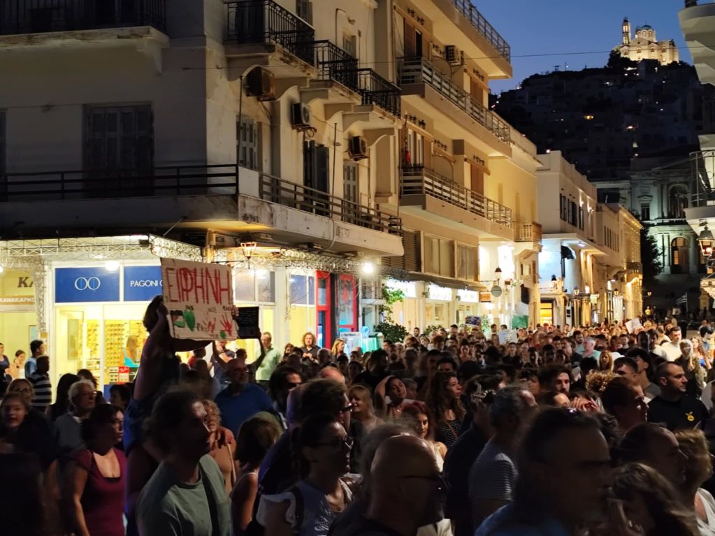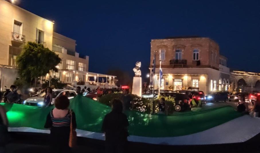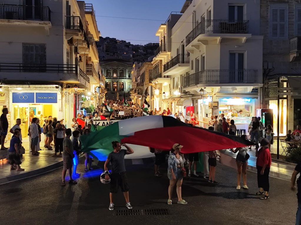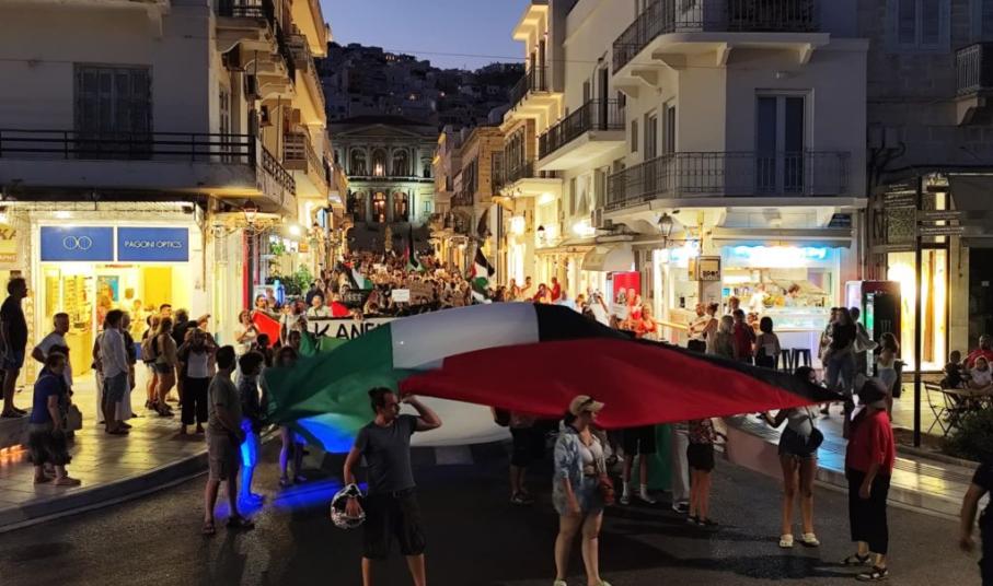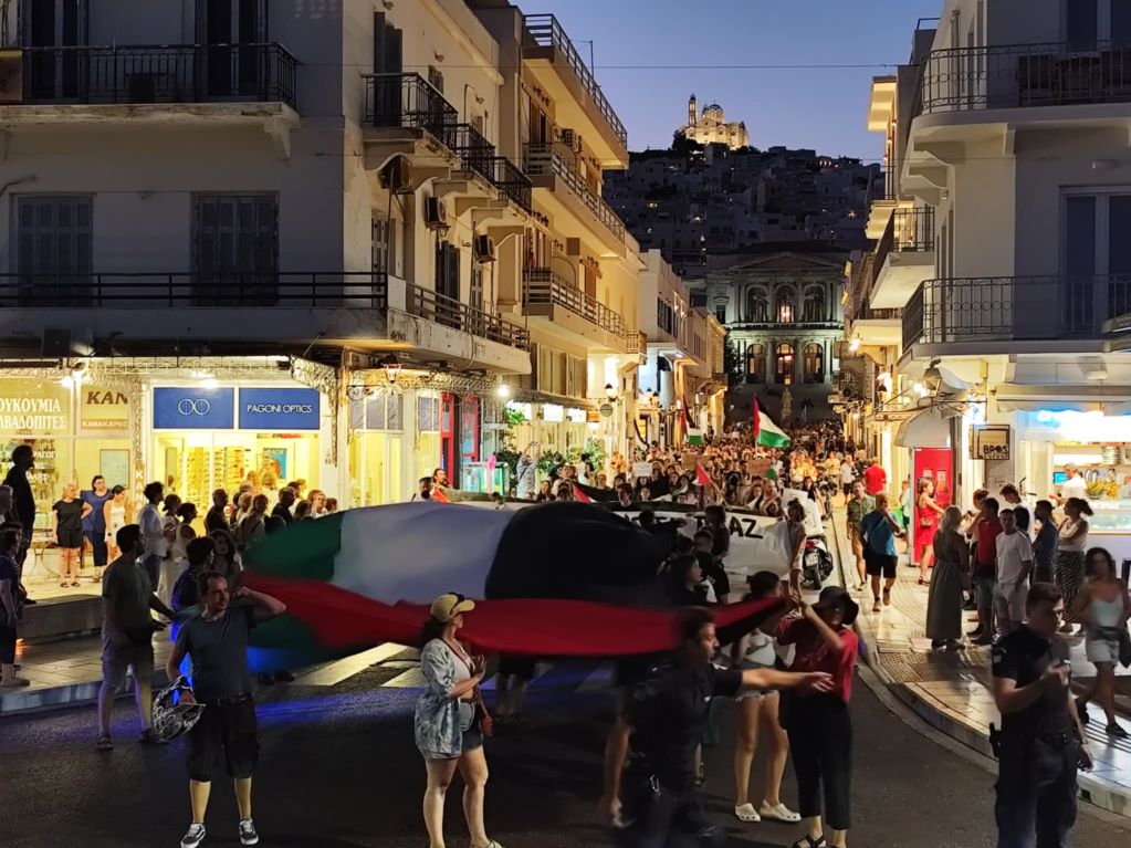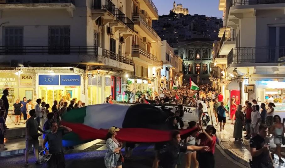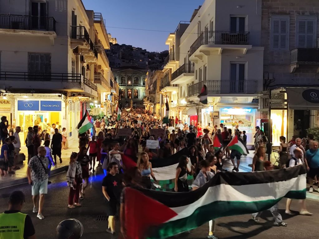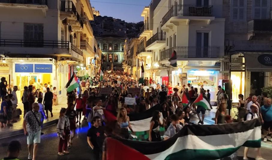 Πλήθος κόσμου κατέκλυσε για άλλη μία φορά τους δρόμους της Ερμούπολης, στο πλαίσιο κινητοποίησης που πραγματοποιήθηκε για την Παλαιστίνη.