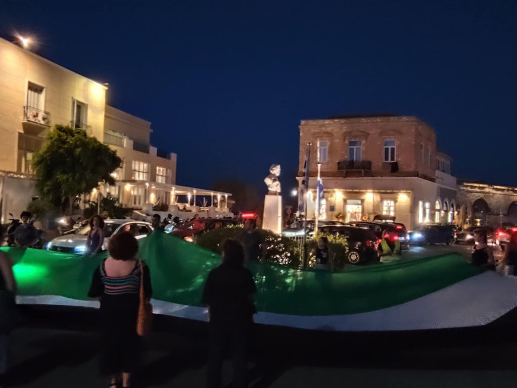 Η συγκέντρωση είχε καθοριστεί για σήμερα στην πλατεία Μιαούλη, ενώ ακολούθησε πορεία στους δρόμους της πόλης, με δεκάδες πολίτες, να φωνάζουν υπέρ των Παλαιστινίων.