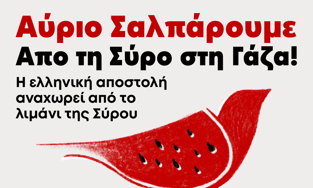 Αύριο, Κυριακή 14 Σεπτεμβρίου, στις 17.00, η Σύρος θα γίνει το σημείο εκκίνησης της ελληνικής αποστολής του Global Sumud Flotilla. Από το λιμάνι της Ερμούπολης, το πλοίο “Οξυγόνο” θα αποπλεύσει για να ενωθεί με τον διεθνή στόλο που κατευθύνεται στη Γάζα, με σκοπό να αμφισβητήσει τον παράνομο αποκλεισμό και να σταθεί στο πλευρό ενός λαού που βιώνει και αντιστέκεται στη γενοκτονία.