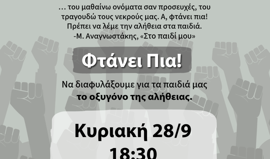 Ως άνθρωποι και πολίτες νιώθουμε την βαθιά ανάγκη να υψώσουμε αλληλέγγυα τη φωνή μας στο πλάι των γονιών που έχουν το θάρρος να κάνουν το ανείπωτο πένθος κραυγή για δικαιοσύνη: «Φτάνει πια!»