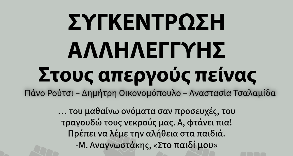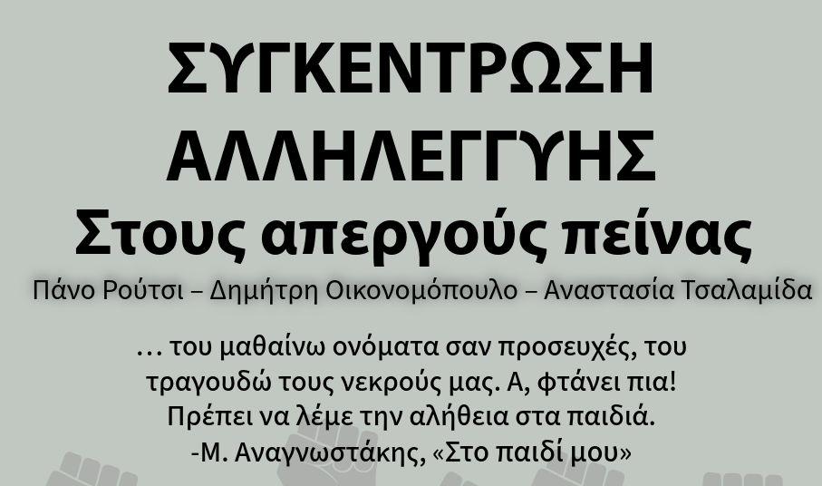 Τα σωματεία και οι σύλλογοι εργαζομένων του νομού Κυκλάδων καλούν σε συγκέντρωση αλληλεγγύης στους απεργούς πείνας Πάνο Ρούτσι, Δημήτρη Οικονομόπουλο και Αναστασία Τσαλαμίδα, η οποία θα πραγματοποιηθεί την Κυριακή 28 Σεπτεμβρίου, στις 18:30, στην πλατεία Μιαούλη στη Σύρο.
