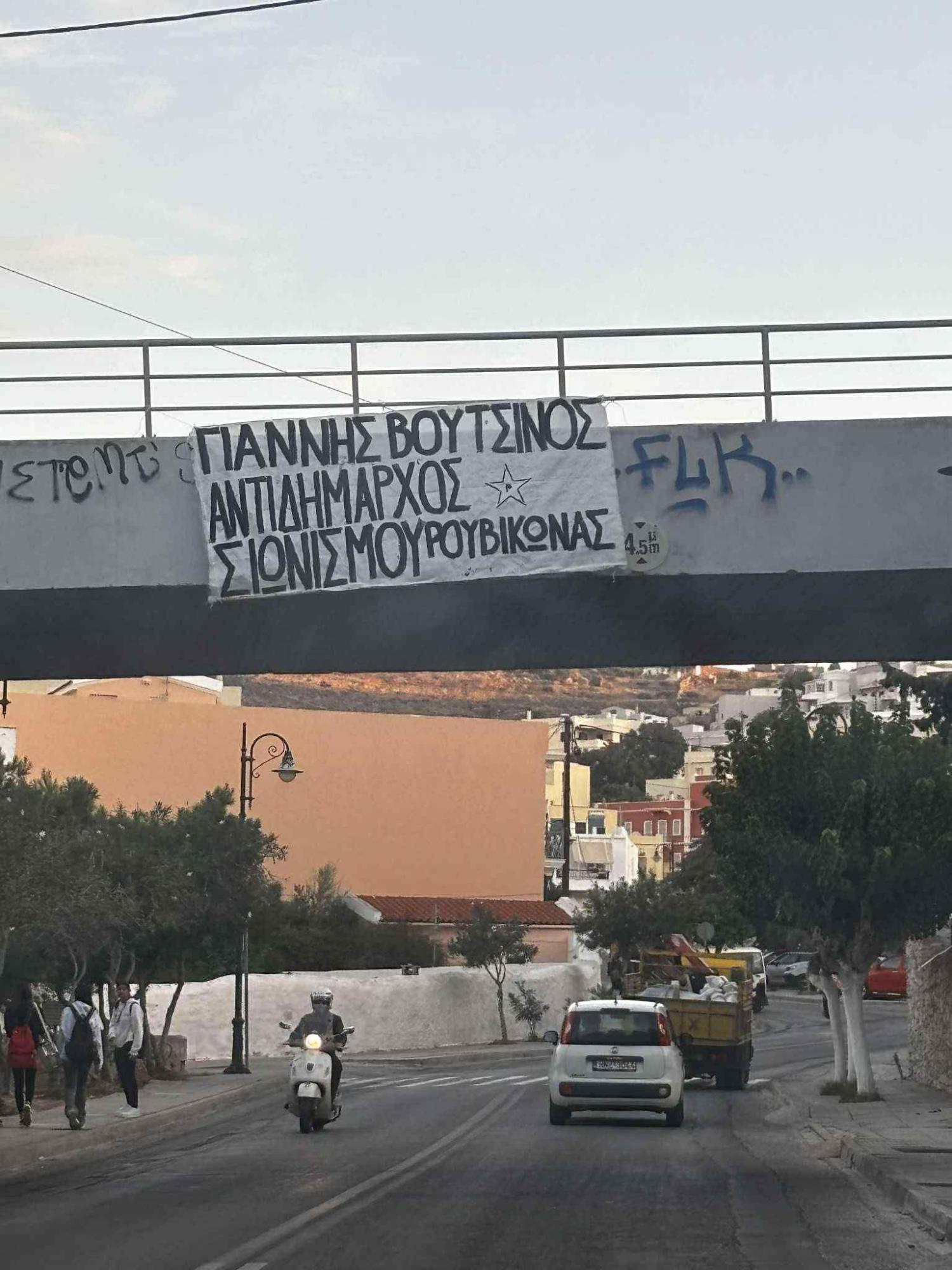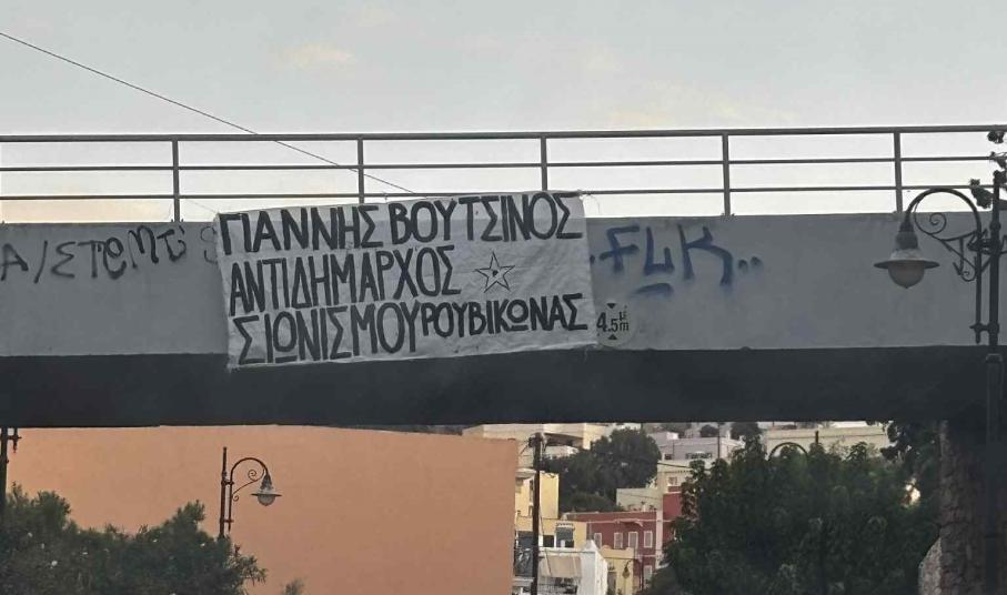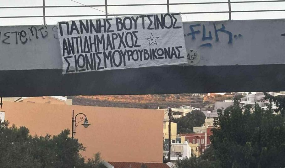 Άγνωστοι τοποθέτησαν πανό στη γέφυρα πάνω από την οδό Ανδρέα Παπανδρέου στην περιοχή της Λαλακιάς, στο οποίο αναγράφεται “Γιάννης Βουτσίνος, αντιδήμαρχος Σιωνισμού - Ρουβίκωνας”.
