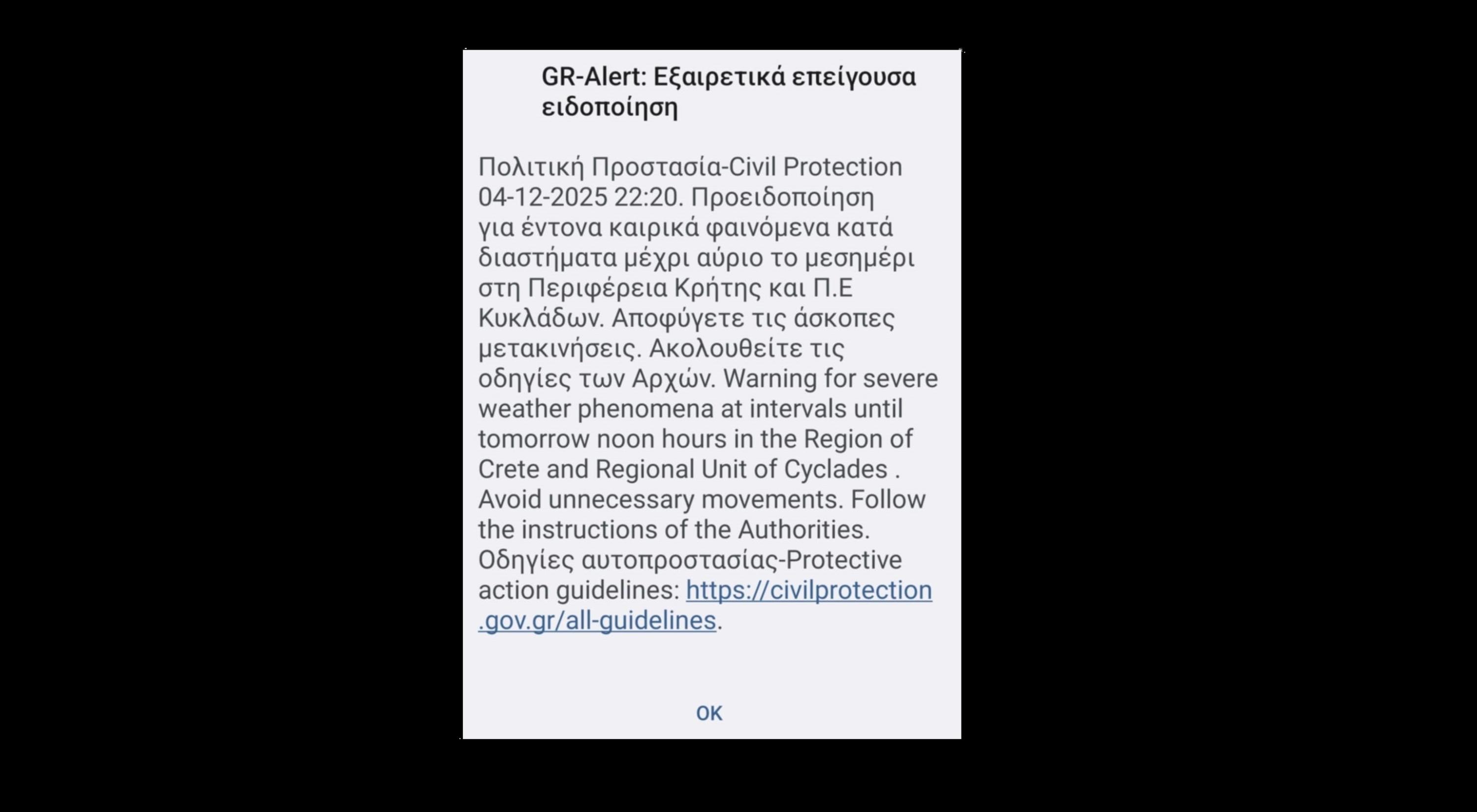 Στις 4 Δεκεμβρίου 2025 η Πολιτική Προστασία εξέδωσε επείγουσα ειδοποίηση, ενημερώνοντας τους πολίτες των Κυκλάδων και της Κρήτης για επικείμενα έντονα καιρικά φαινόμενα που θα εμφανίζονται κατά διαστήματα έως το μεσημέρι της επόμενης ημέρας.