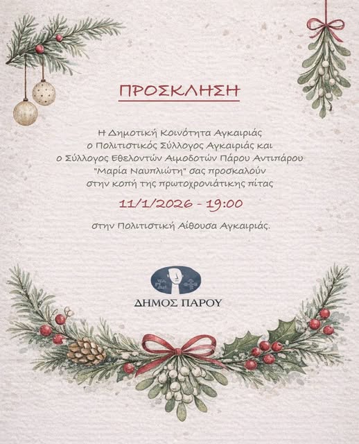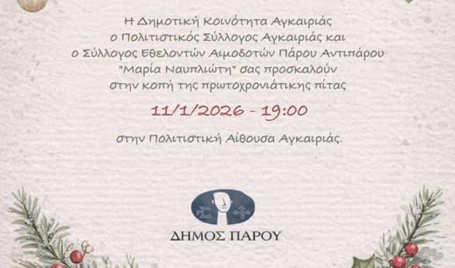 Ο Σύλλογος Εθελοντών Αιμοδοτών Πάρου Αντιπάρου "Μαρία Ναυπλιώτη" διευρύνει το πνεύμα της εθελοντικής αιμοδοσίας και σας προσκαλεί στην κοπή της πρωτοχρονιάτικης πίτας, που θα πραγματοποιηθεί από κοινού με την Κοινότητα Αγκαριάς και τον Πολιτιστικό Σύλλογο Αγκαριάς.