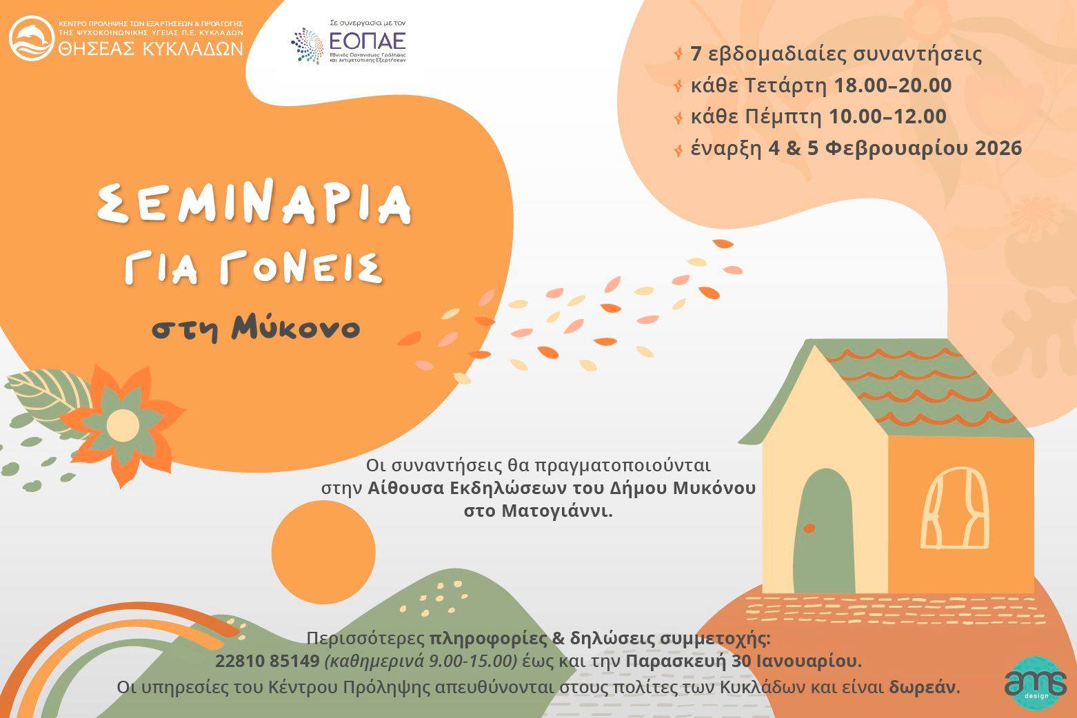 Το Κέντρο Πρόληψης των Εξαρτήσεων και Προαγωγής της Ψυχοκοινωνικής Υγείας Π.Ε. Κυκλάδων «ΘΗΣΕΑΣ ΚΥΚΛΑΔΩΝ», σε συνεργασία με τον Εθνικό Οργανισμό Πρόληψης και Αντιμετώπισης Εξαρτήσεων (Ε.Ο.Π.Α.Ε.), υλοποιεί σεμινάρια για γονείς στη Μύκονο.