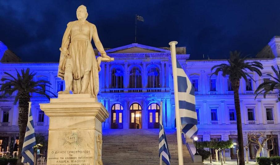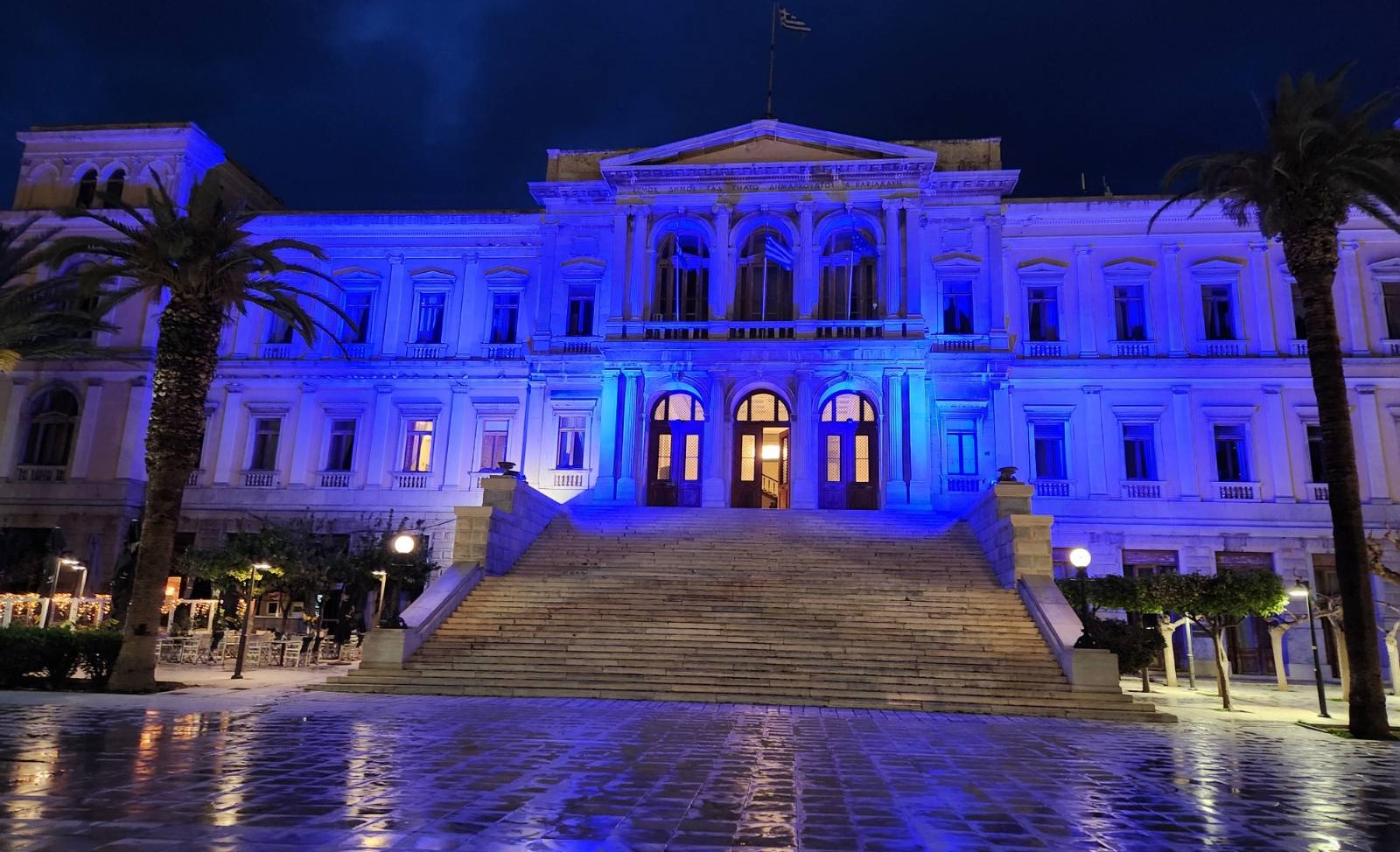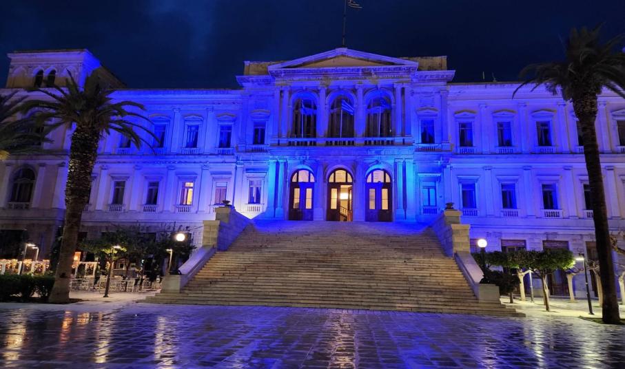 Με αφορμή την Παγκόσμια Ημέρα Ευαισθητοποίησης για τον Αυτισμό, χθες Πέμπτη 2 Απριλίου, ο Δήμος Σύρου - Ερμούπολης συμμετέχει ενεργά στην παγκόσμια πρωτοβουλία ενημέρωσης, φωταγωγώντας το δημαρχιακό μέγαρο στην πλατεία Μιαούλη με το χαρακτηριστικό μπλε χρώμα.