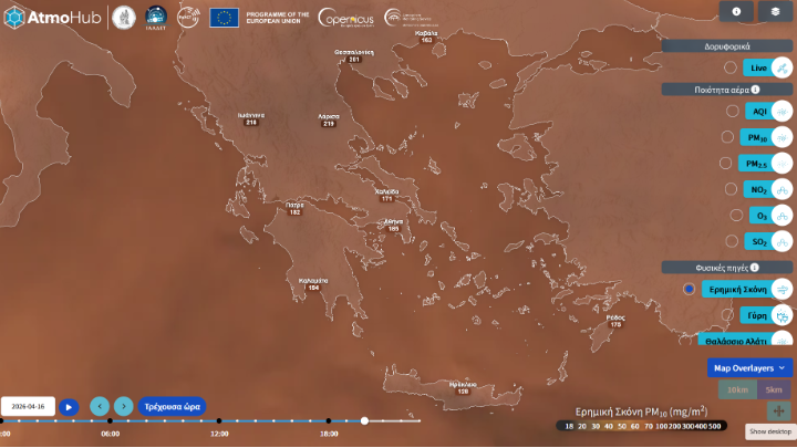 Συνεχίζεται η επίδραση του φαινομένου μεταφοράς σκόνης στη χώρα, με τη σκόνη να έχει καλύψει το σύνολο της επικράτειας, όπως αναφέρει σε σχετική ενημέρωση ο κόμβος πληροφόρησης για την ατμοσφαιρική σύσταση στην Ελλάδα, AtmoHub. Επιπλέον, όπως τονίζεται, το φαινόμενο είναι μέτριας έντασης και συνοδεύεται από νεφώσεις, περιορίζοντας την ηλιοφάνεια και δημιουργώντας ένα μουντό τοπίο.