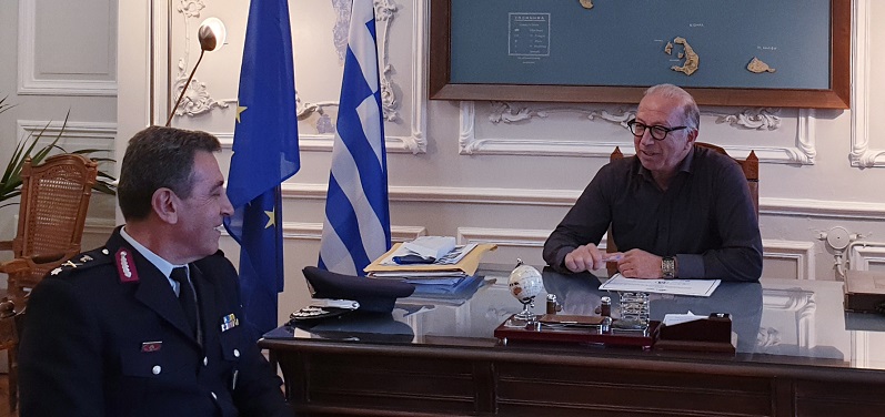 Εθιμοτυπική συνάντηση με τον Αντιπεριφερειάρχη Κυκλάδων κ. Γιώργο Λεονταρίτη είχε σήμερα το μεσημέρι στα γραφεία της έδρας της Περιφέρειας Νοτίου Αιγαίου στη Σύρο ο νέος Γενικός Περιφερειακός Αστυνομικός Διευθυντής Νοτίου Αιγαίου, Ταξίαρχος Ιωσήφ Κανακουσάκης, ο οποίος ανέλαβε τα καθήκοντά του μετά τις πρόσφατες κρίσεις της ηγεσίας της Ελληνικής Αστυνομίας.