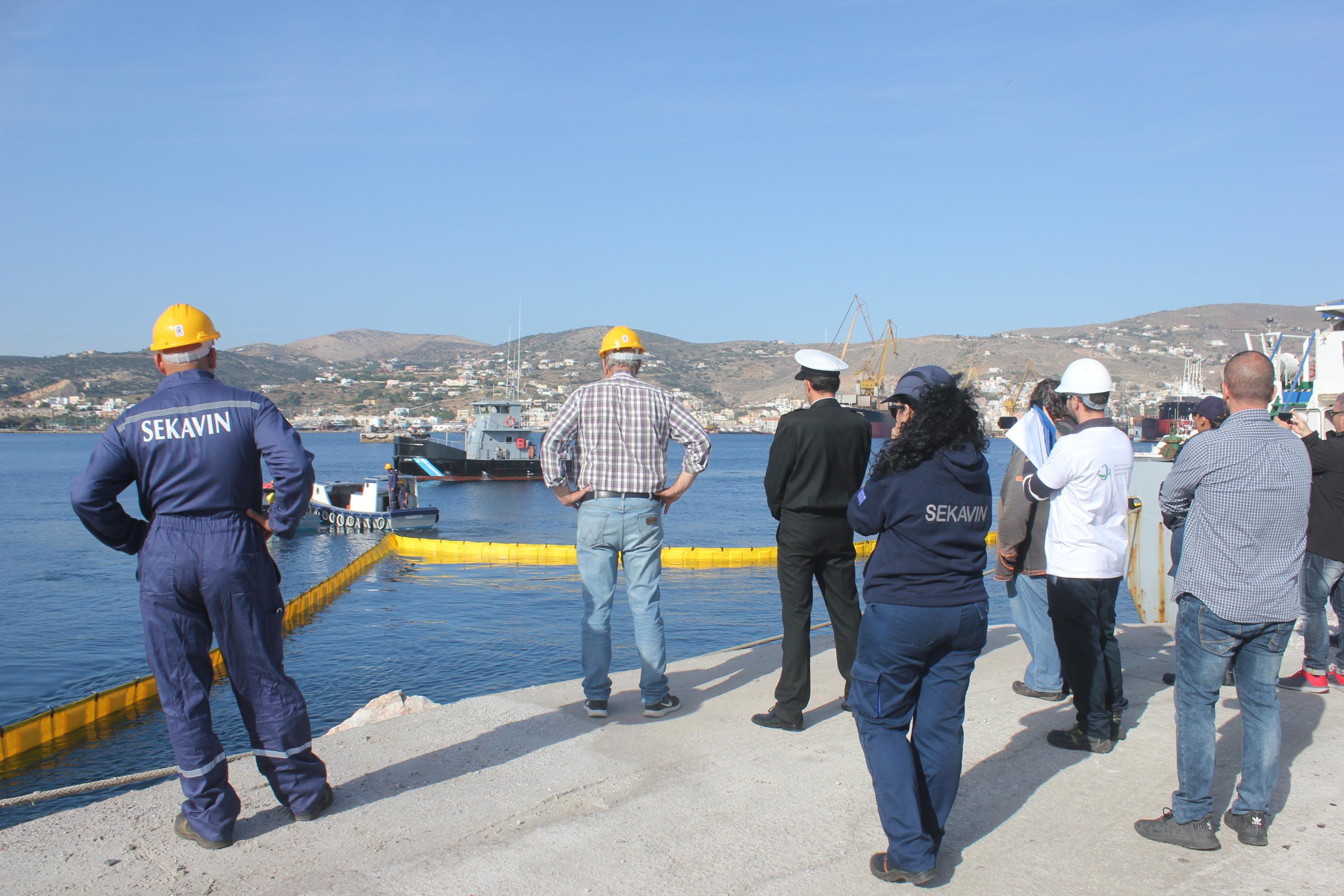 “Η ΣΕΚΑΒΙΝ με το προσωπικό που έχει διαθέσει, αναπτύσσει το φράγμα. Το σενάριο της άσκησης θέλει κατά την διαδικασία εμπορικής πράξης δεξαμενόπλοιου που λειτουργεί για τις ανάγκες της επιχείρησης να έχει επιφέρει μία ατυχηματική ρύπανση. Έχει ενεργοποιηθεί όλος ο μηχανισμός. Η επιχείρηση διαθέτει τα μέσα της, ενεργοποιεί το προσωπικό της και άμεσα ενημερώνει την Υπηρεσία μας. Το Λιμεναρχείο Σύρου άμεσα ενεργοποιεί τα δικά του μέσα. Έχει φθάσει και το πλωτό το αντιρρυπαντικό του Λιμεναρχείου Σύρου (ΠΛΣ 421), που έχει μεγάλες δυνατότητες για την αντιμετώπιση περιστατικών ρύπανσης, όπως επίσης και το ταχύπλοο περιπολικό σκάφος του Λιμεναρχείου Σύρου (ΠΛΣ 603). Όλοι μαζί οι εμπλεκόμενοι αναπτύσσουν τις εργασίες που επιβάλλονται για να αντιμετωπισθεί η ρύπανση με τον καλύτερο δυνατό τρόπο” υπογράμμισε ο ίδιος, τονίζοντας πως αμέσως μετά με χρήση ειδικού εξοπλισμού (skimmer) “ανακτάται η πετρελαιοκηλίδα για να απομακρυνθεί”.