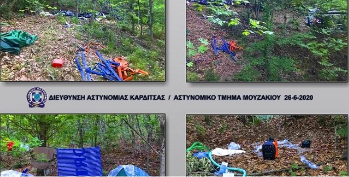 Στο χώρο εντοπίστηκαν ακόμη και κατασχέθηκαν τέσσερα πρόχειρα καταλύματα με είδη ρουχισμού και διατροφής, μία αυτοσχέδια δεξαμενή με νερό, καθώς και σκαπτικά εργαλεία και σύνεργα ποτίσματος για την καλλιέργεια των φυτών.