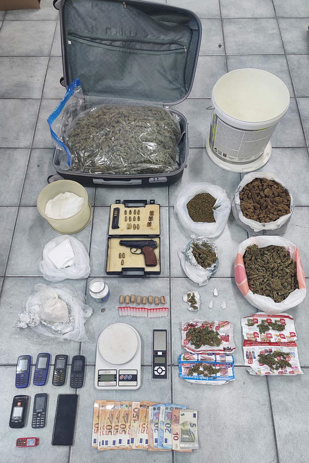 Κατασχέθηκαν -512- γραμμ. κοκαΐνη, -5- κιλά & 886 γραμμ. κάνναβη, πιστόλι, -26- φυσίγγια, -2- ζυγαριές, -8- αυτοσχέδια βεγγαλικά και -8- κινητά τηλέφωνα.