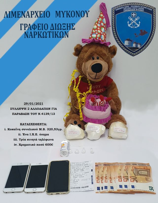 Συγκεκριμένα ο ανωτέρω 43χρονος προμηθευόταν ναρκωτικές ουσίες από έτερα άτομα στην Αθήνα τις οποίες και μετέφερε για την περαιτέρω διακίνηση τους στη Μύκονο. Στο πλαίσιο συντονισμένων αστυνομικών ελέγχων, οι ανωτέρω αλλοδαποί εντοπίστηκαν να εξέρχονται την 29-01-2021 από Ε/Γ-Ο/Γ πλοίο στο λιμένα της Μυκόνου, ο 43χρονος με Ι.Χ.Ε όχημα ενώ η 32χρονη ως πεζή. Στη συνέχεια αμφότεροι τέθηκαν υπό διακριτική επιτήρηση. Πρώτες πρωινές ώρες σήμερα, στελέχη του Γραφείου Δίωξης Ναρκωτικών με τη συνδρομή χειριστή συνοδού σκύλου ανίχνευσης ναρκωτικών ουσιών της Λιμενικής Αρχής Μυκόνου, ακινητοποίησαν αμφότερους τους αλλοδαπούς οι οποίοι κινούνταν με Ι.Χ.Ε. όχημα κατευθυνόμενοι προς το λιμένα Μυκόνου. Μετά από ενδελεχή έλεγχο διαπιστώθηκε η μεν 32χρονη να μεταφέρει επιμελώς κρυμμένα εντός λούτρινου παιχνιδιού, τρεις (03) νάιλον συσκευασίες με ποσότητα κοκαΐνης, σε μορφή βράχου, τριακοσίων δέκα επτά γραμμαρίων και τριάντα πέντε δεκάτων του γραμμαρίου (317,35γρ), ο δε 43χρονος να μεταφέρει και αυτοβούλως παραδίδει τέσσερις (04) αυτοσχέδιες ισοβαρείς νάιλον συσκευασίες, περιέχουσες λευκή σκόνη κοκαΐνης συνολικού βάρους τριών γραμμαρίων και δέκα οκτώ δεκάτων του γραμμαρίου (3,18γρ).