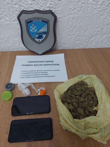 Συγκεκριμένα, σε αστυνομικό έλεγχο που διενεργήθηκε στον 27χρονο και στην 20χρονη κατά τον κατάπλου Ε/Γ -Ο/Γ πλοίου στον λιμένα “ΑΘΗΝΙΟ” ν. Θήρας από στελέχη της οικείας Λιμενικής Αρχής, βρέθηκαν στην κατοχή τους και κατασχέθηκαν ποσότητα ακατέργαστης κάνναβης συνολικού μικτού βάρους 110,2 γραμμαρίων, ποσότητα κοκαΐνης συνολικού μικτού βάρους 19,2 γραμμαρίων, ένας μεταλλικός και ένα πλαστικός τρίφτης με υπολείμματα κάνναβης.
