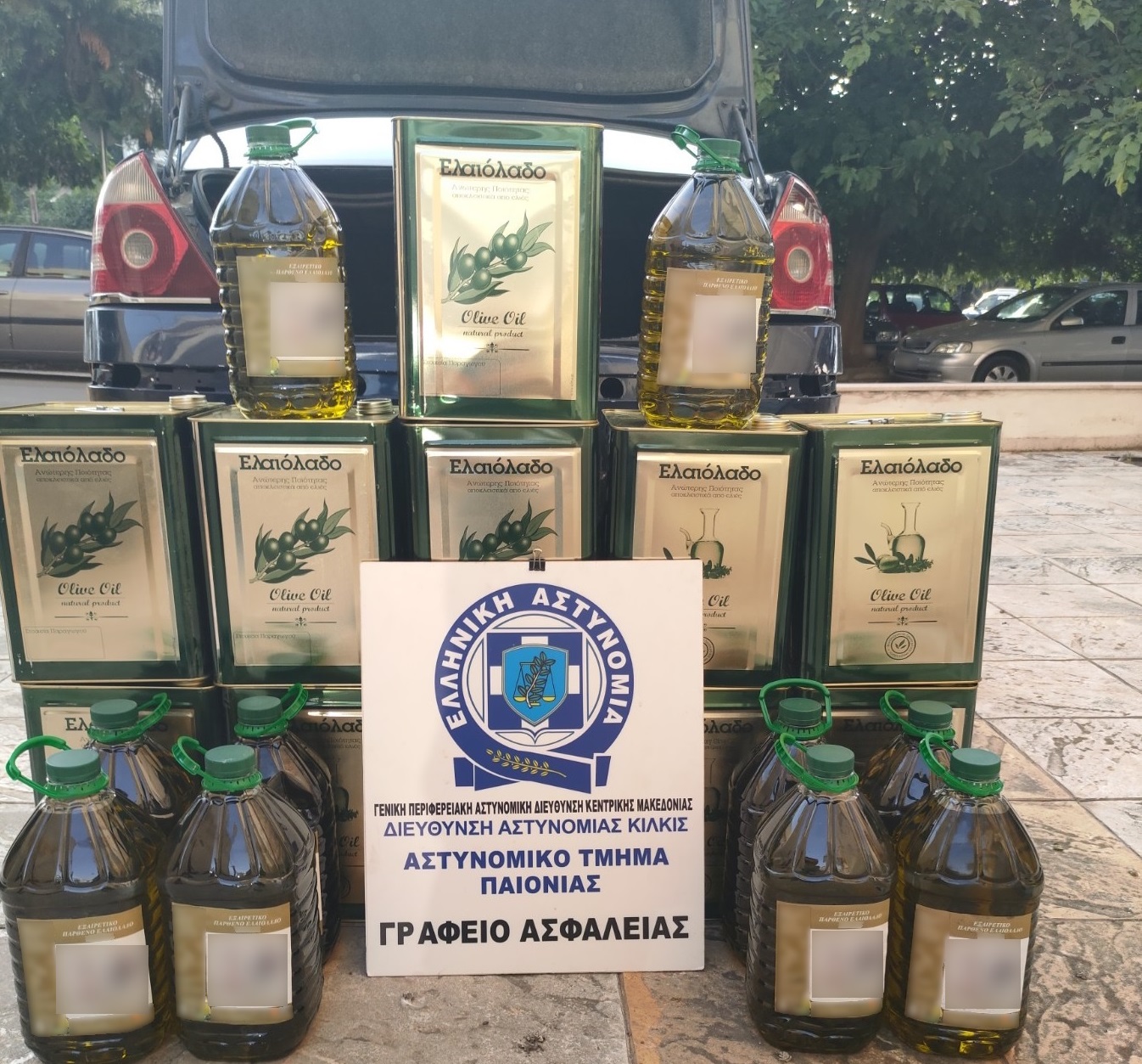 «Συνελήφθη χθες (21 Ιουνίου 2024) το πρωί σε περιοχή του Κιλκίς, από αστυνομικούς του Γραφείου Ασφάλειας του Αστυνομικού Τμήματος Παιονίας, ένας ημεδαπός άνδρας, καθώς εντοπίστηκε να οδηγεί όχημα ιδιοκτησίας του και σε έρευνα που πραγματοποιήθηκε, βρέθηκαν και κατασχέθηκαν 21 δοχεία, τα οποία έφεραν την επιγραφή «Εξαιρετικό Παρθένο Ελαιόλαδο» ή «Ελαιόλαδο», τα οποία περιείχαν λάδι αμφιβόλου γνησιότητας και προέλευσης. Το παραπάνω όχημα κατασχέθηκε, καθώς και ένα κινητό τηλέφωνο που βρέθηκε στην κατοχή του.