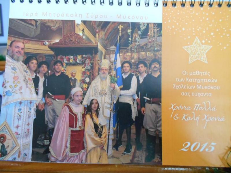 Η παρουσίαση του νέου επιτραπέζιου ημερολογίου πραγματοποιήθηκε το πρωί της Κυριακής στα παιδιά του Ανώτερου και Μέσου Κατηχητικού Σχολείου στο παρεκκλήσιο της Αγίας Αικατερίνης στη Μύκονο. Το ημερολόγιο του 2015 είναι αφιερωμένο στις Λειτουργικές και Λατρευτικές εκδηλώσεις των παιδιών.