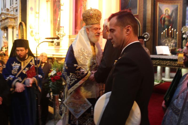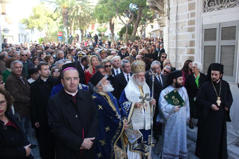 Παρουσία του Καθολικού Επισκόπου Σύρου Σεβ. π. Πέτρου Στεφάνου, των τοπικών αρχών, των στρατιωτικών αρχών και των σωμάτων ασφαλείας, σπουδαστών της Ακαδημίας Εμπορικού Ναυτικού, της μαθητιώσας νεολαίας του νησιού αλλά και πλήθους πιστού, ο Σεβασμιώτατος κ. Δωρόθεος απένειμε στον Πρόεδρο της Δημοκρατίας το μετάλλιο της Ιεράς Μητροπόλεως.