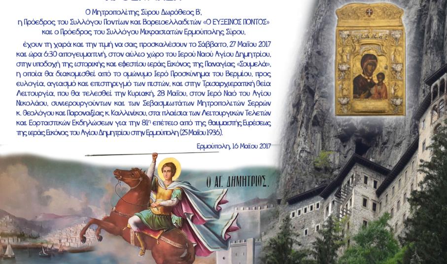 Ο Σεβασμιώτατος Μητροπολίτης Σύρου Δωρόθεος Β', η Πρόεδρος του Συλλόγου Ποντίων και Βορειοελλαδιτών Σύρου "Ο Εύξεινος Πόντος", Ουρανία Πανταζίδου και ο Πρόεδρος του Συλλόγου Μικρασιατών Σύρου Νίκος Λειβαδάρας έχουν τη χαρά και την τιμή να προσκαλέσουν το ευσεβές κοινό του νησιού το Σάββατο, 27 Μαίου 2017 και ώρα 18:30 στον αύλειο χώρο του Ι.Ναού Αγίου Δημητρίου, στην υποδοχή της ιστορικής και εφεστίου ιεράς Εικόνος της Παναγίας Σουμελά.