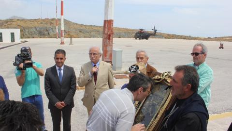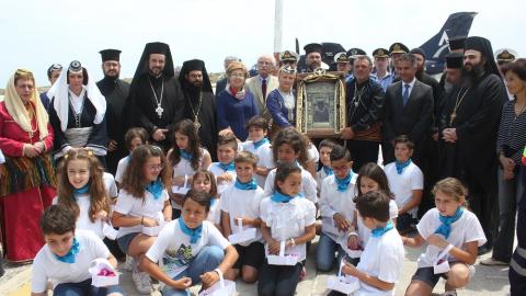 Μέλη του κλήρου της Ιεράς Μητρόπολης Σύρου, καθώς επίσης, ο Δήμαρχος Σύρου – Ερμούπολης, Γιώργος Μαραγκός, εκπρόσωποι των Σωμάτων Ασφαλείας της Σύρου και των Κυκλάδων, αλλά και μαθητές του 1ου Δημοτικού Σχολείου Ερμούπολης (Δ΄ Τάξη) μετέβησαν στις εγκαταστάσεις του αεροδρομίου Σύρου, όπου και αφίχθη η εικόνα, την οποία και μετέφερε μεταξύ άλλων, η πρόεδρος του Συλλόγου Ποντίων και Βορειοελλαδιτών Σύρου “Ο Εύξεινος Πόντος”, Ουρανία Πανταζίδου. Η εικόνα που διεκομίσθη από το ομώνυμο ιερό Προσκύνημα του Βερμίου προς τη Σύρο, θα μεταφερθεί επίσημα στον Ι.Ν. του Αγίου Δημητρίου Ερμούπολης, αύριο, Σάββατο, ενώ την Κυριακή 28 Μαΐου θα τελεσθεί στον Ι.Ν. του Αγίου Νικολάου Ερμούπολης, Τρισαρχιερατική Θεία Λειτουργία από τον Σεβασμιώτατο Μητροπολίτη Σύρου, κ. Δωρόθεο Β΄, συνιερουργούντων των Σεβασμιωτάτων Μητροπολιτών Σερρών κ. Θεολόγου και Παροναξίας κ. Καλλινίκου, στο πλαίσιο των Λειτουργικών Τελετών και Εορταστικών Εκδηλώσεων για την 81η επέτειο από της ευρέσεώς της στον Αγ. Δημήτριο (Ερμούπολη, 25 Μαΐου 1936).