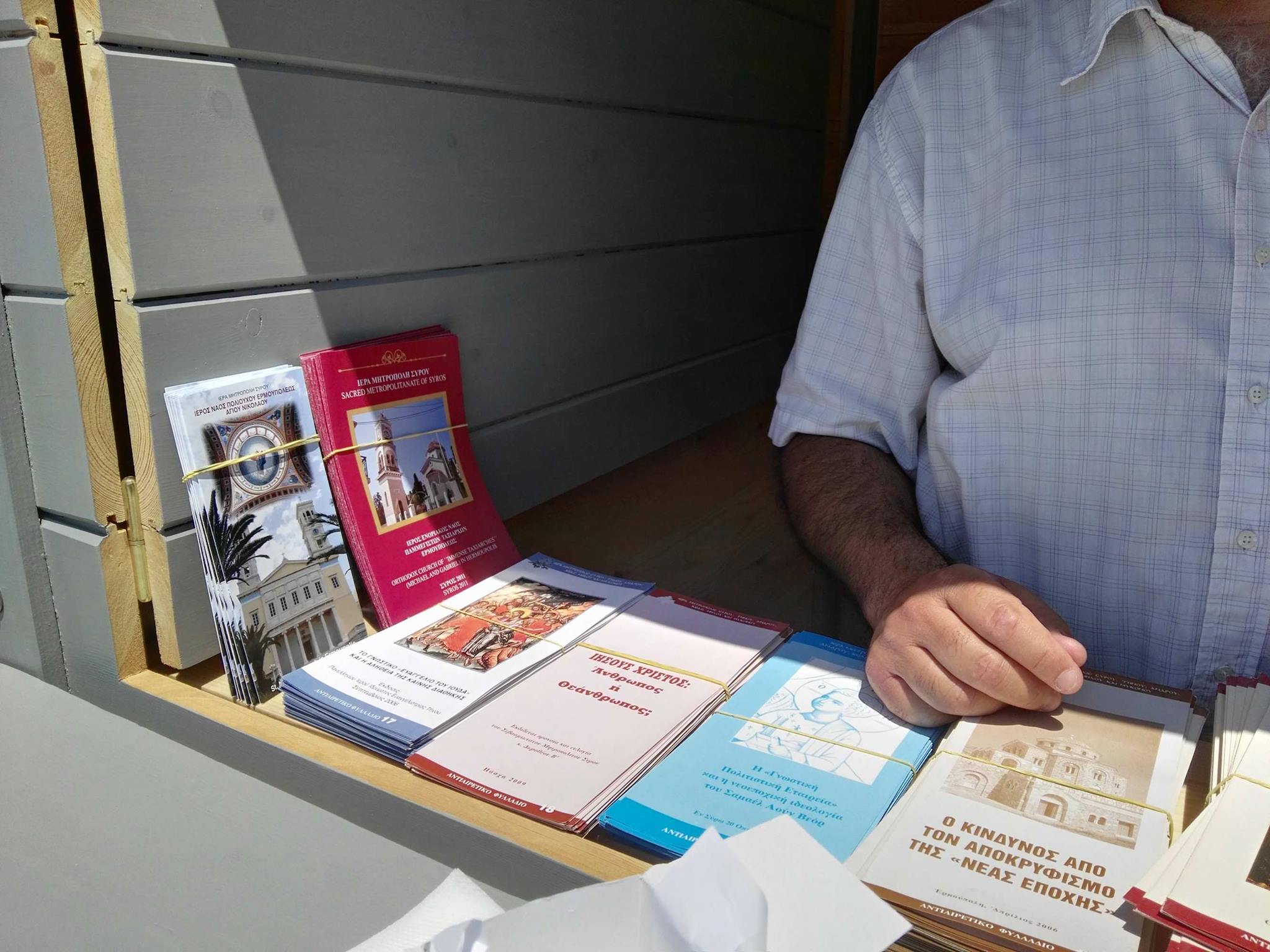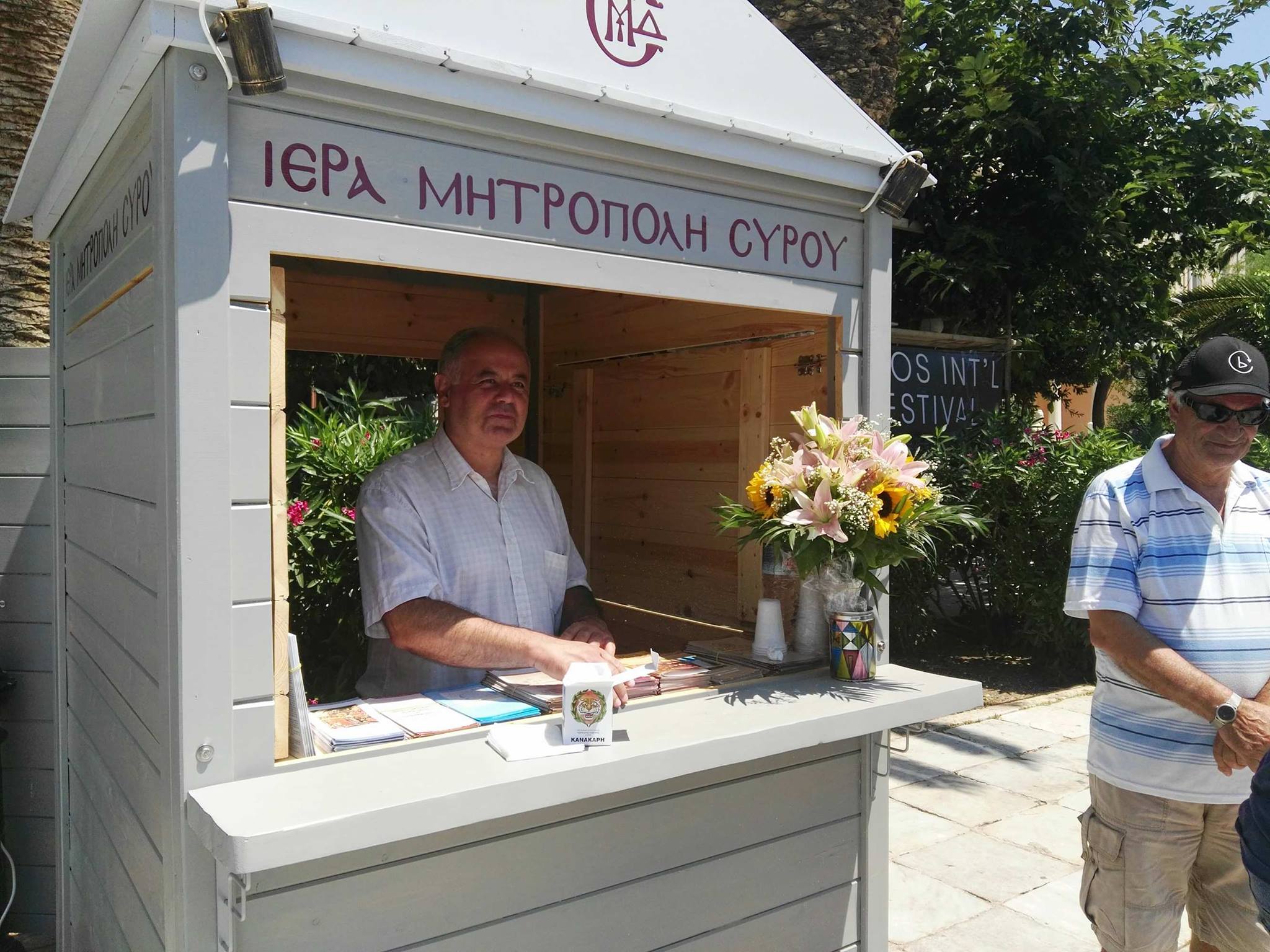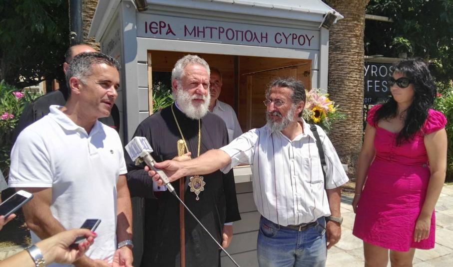 Πλαισιωμένος από τον Δήμαρχο Σύρου – Ερμούπολης, Γιώργο Μαραγκό , την πρόεδρο της Δημοτικής Κοινότητας Ερμούπολης, Ανθή Χαλκιά καθώς επίσης τον Πρωτοπρ. π. Φλαβιανό Αλμπέσκου και ανθρώπους που στηρίζουν εθελοντικά το έργο της Ιεράς Μητρόπολης Σύρου, αναφέρθηκε επιγραμματικά στην προσπάθεια δημιουργίας και στη λειτουργία του περιπτέρου, από το οποίο κάτοικοι αλλά και επισκέπτες της πρωτεύουσας των Κυκλάδων θα έχουν τη δυνατότητα να προμηθεύονται πλούσιο υλικό (στην ελληνική και αγγλική γλώσσα) από τους ναούς της Σύρου. Όπως τόνισε, το περιεχόμενό τους πέρα από το ποιμαντικό έργο της Μητρόπολης, αφορά και στην ιστορία των Ορθόδοξων ναών του τόπου.