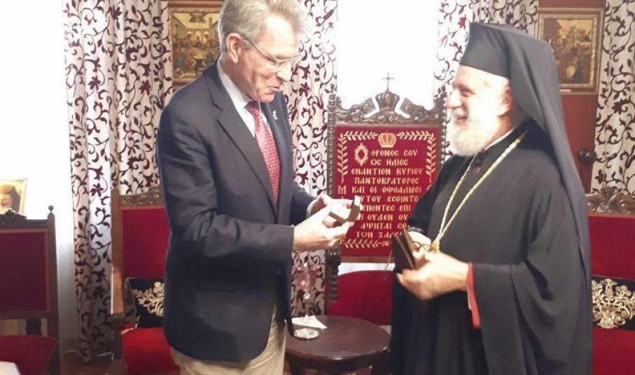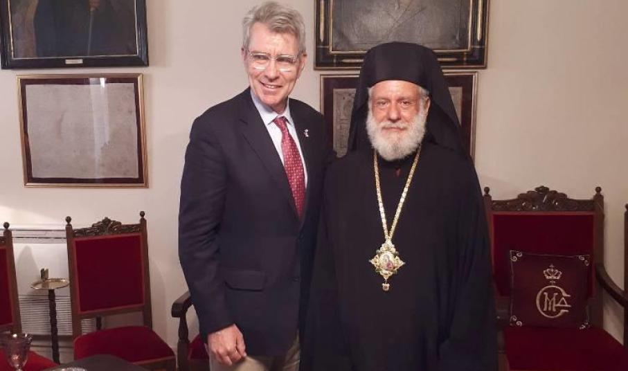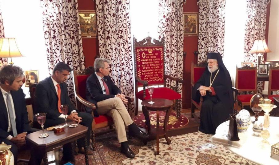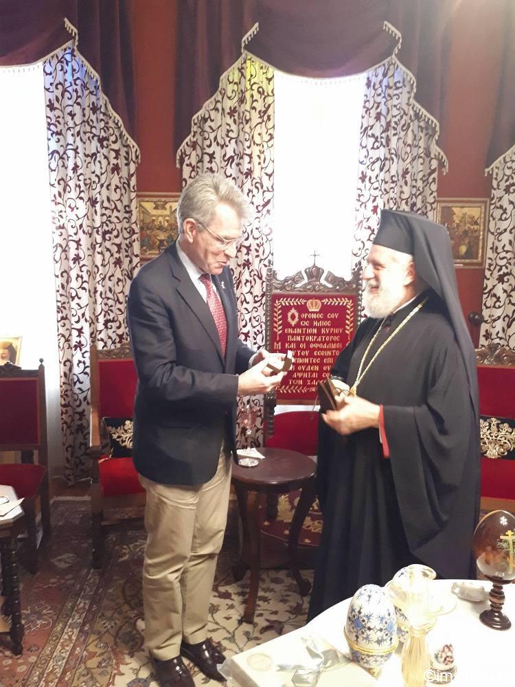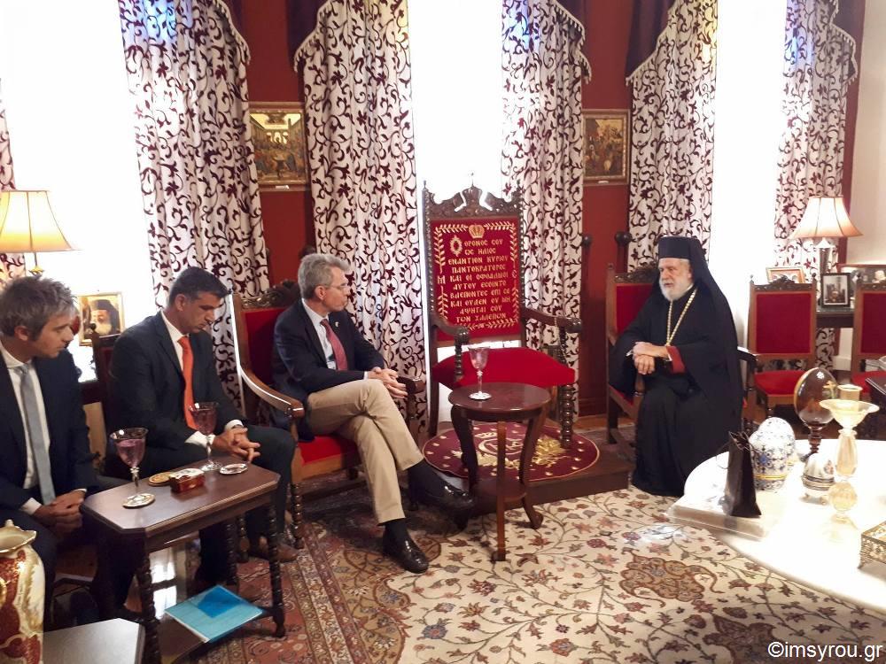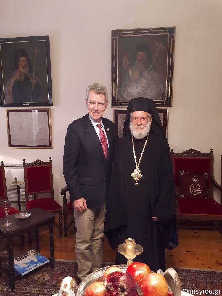 Τον Σεβασμιώτατο κ Δωρόθεο Β' επεσκέφθη σήμερα στο Επισκοπείο Ερμουπόλεως ο Εξοχώτατος Πρέσβυς των ΗΠΑ στην Ελλάδα κ. Geoffrey R. Pyatt, με τον οποίο παρέμεινε επί ώρα στην Αίθουσα του Θρόνου και συνεζήτησαν για θέματα, που αφορούν τη Σύρο.