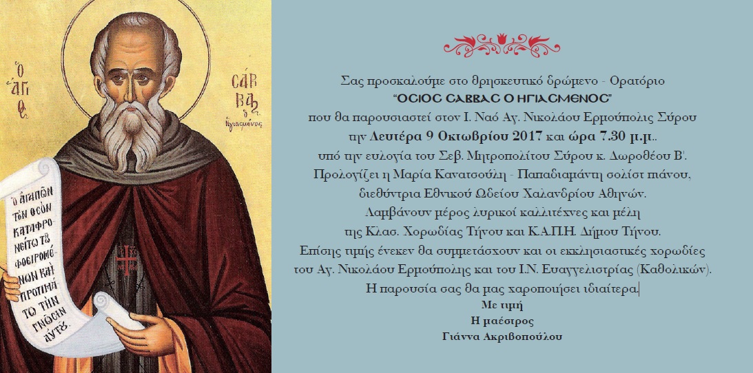Σας προσκαλούμε στο θρησκευτικό δρώμενο - Ορατόριο ‘‘ΟΣΙΟΣ ΣΑΒΒΑΣ Ο ΗΓΙΑΣΜΕΝΟΣ” που θα παρουσιαστεί στον Ι. Ναό Αγ. Νικολάου Ερμούπολις Σύρου την Δευτέρα 9 Οκτωβρίου 2017 και ώρα 7.30 μ.μ.. υπό την ευλογία του Σεβ. Μητροπολίτου Σύρου κ. Δωροθέου Β’.