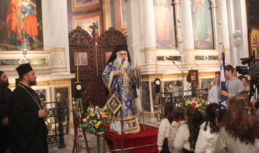 Καταλήγοντας, ο Σεβασμιώτατος αφιέρωσε στους σπουδαστές και τις σπουδάστριες της Ακαδημίας Εμπορικού Ναυτικού το παρακάτω ποίημα: «Μην φωνάζεις δυνατά. Όλοι οι άνθρωποι φωνάζουν δυνατά. Είναι ωραία να μιλάμε σιγανά, άκου τη θάλασσα, μιλάει. Τι λέει; Ελευθερία λέει. Ελευθερία, λέει». Όπως τόνισε, αυτή την ελευθερία θέλησε να φέρει ο Χριστός στην ψυχή, στην καρδιά και τη σκέψη του ανθρώπου, ερχόμενος στον κόσμο. «Την ελευθερία που του προσφέρει τη δύναμη να ταξιδεύει σε αυτά τα μεγάλα και ατέρμονα πελάγη της καθημερινότητας και να βρίσκει πάντα το έμβιο και γαλήνιο λιμάνι του».