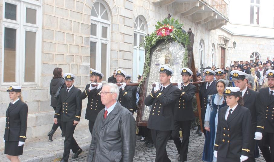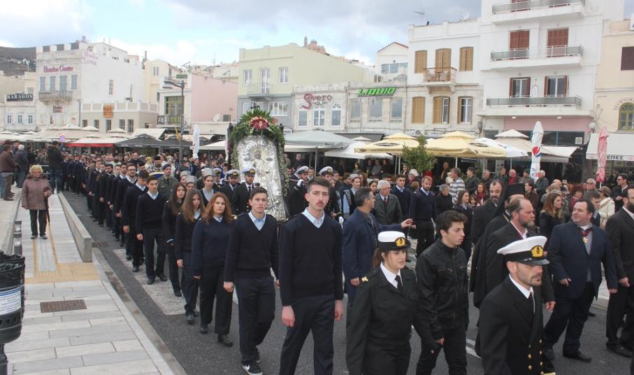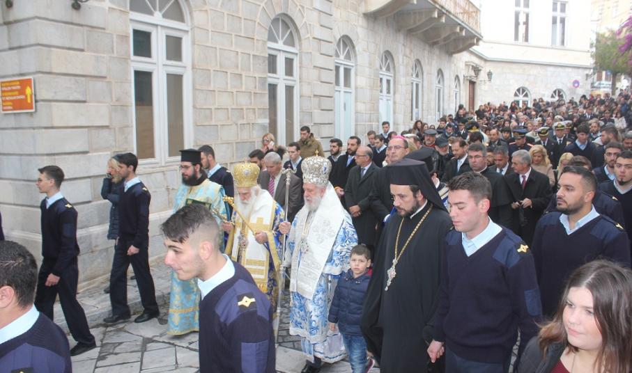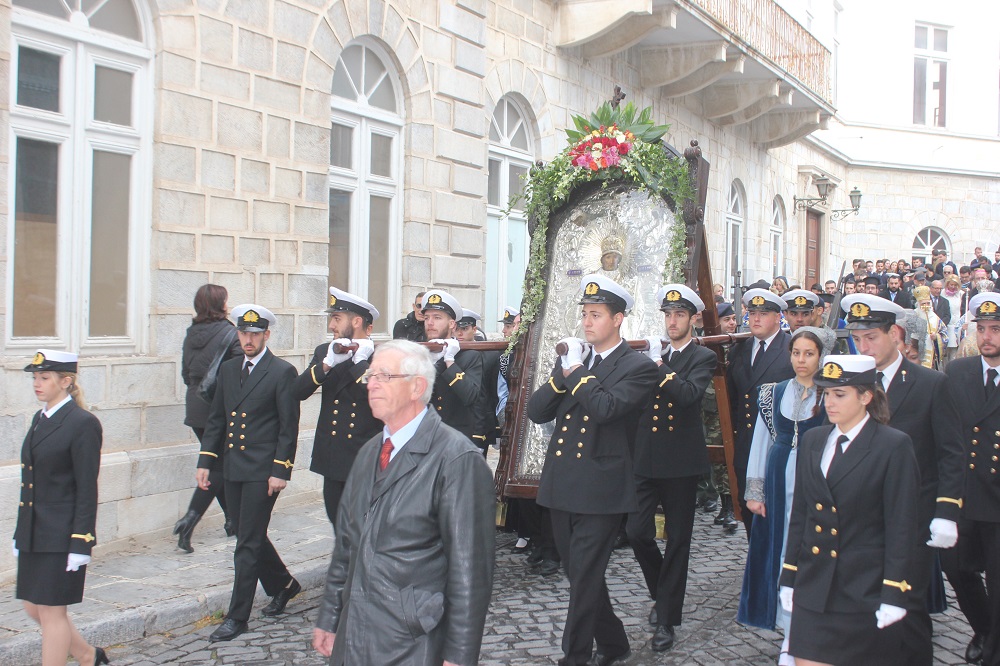 Η λιτανεία που ακολούθησε μετά το πέρας της Θείας Λειτουργίας ξεκίνησε την πορεία της από τον Άγιο Νικόλαο και κατευθύνθηκε στην Πλατεία Μιαούλη, όπου αναπέμφθηκε δέηση υπέρ των ναυτιλομμένων.