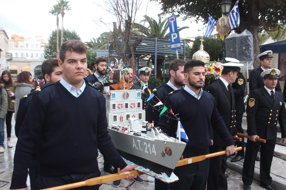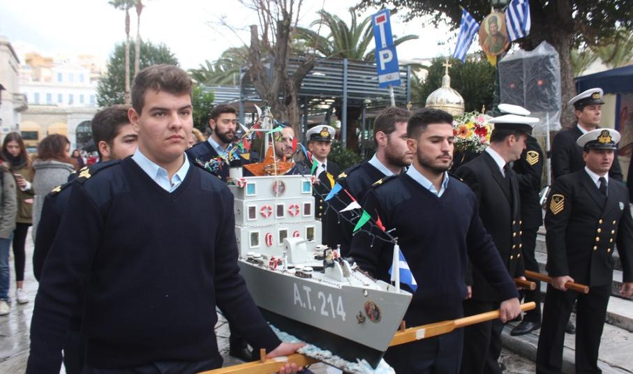 Η Εικόνα του Αγίου Νικολάου κατέληξε στην Πλατεία Κανάρη, όπου πραγματοποιήθηκε η καθιερωμένη ρίψη στεφάνων στη θάλασσα, στη μνήμη των ναυτικών που χάθηκαν ταξιδεύοντας στα πελάγη και τους ωκεανούς της οικουμένης, αλλά και εκείνων που αγωνίστηκαν υπέρ της ελευθερίας και ανεξαρτησίας της πατρίδας μας. Τα στέφανα έριξαν ο Σεβασμιώτατος Μητροπολίτης Σύρου κ. Δωρόθεος Β’, ο Διοικητής της 6ης Περιφέρειας Λιμενικού Σώματος Νίκος Σκευοφύλακας και ο πρόεδρος της Ένωσης Συνταξιούχων Ναυτικών Σύρου, Γιώργος Μηλιός. Τιμές απέδωσαν πλοία του Πολεμικού Ναυτικού και του Λιμενικού Σώματος, καΐκια και μικρά ιστιοπλοϊκά σκάφη του Ναυτικού Ομίλου Σύρου. Αμέσως μετά, η Εικόνα επέστρεψε στον Ιερό Ναό Αγίου Νικολάου, μέσω της οδού Θυμάτων Σπερχειού.