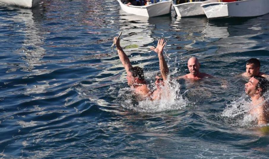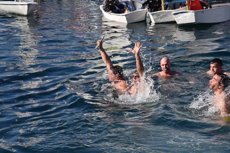 Αμέσως μετά, ο Σεβασμιώτατος κ. Δωρόθεος Β' , επιβαίνων σκάφους του Λιμενικού Σώματος, έριψε από την πλώρη του το Σταυρό στη θάλασσα, τον οποίο έσπευσαν να ανασύρουν δώδεκα άντρες και μία γυναίκα.