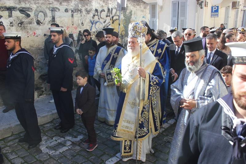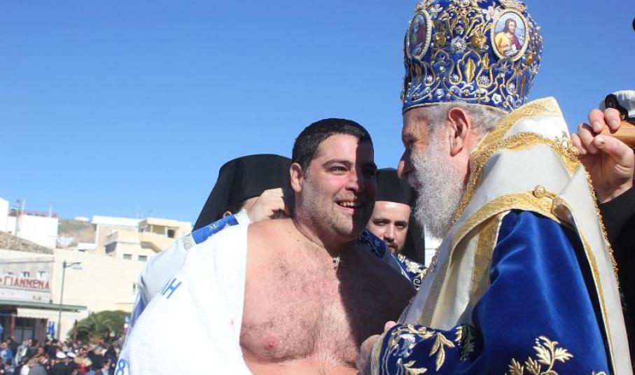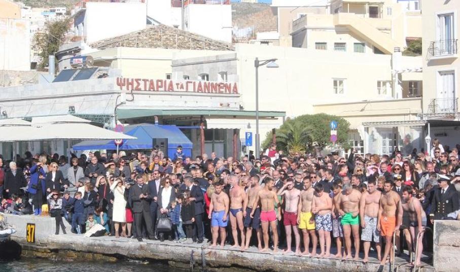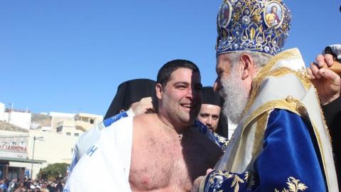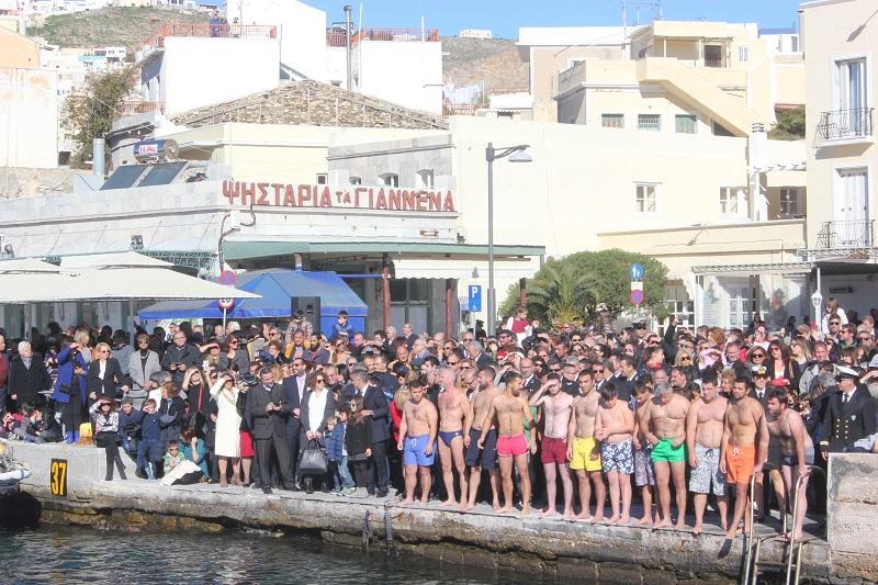 Τον Τίμιο Σταυρό, υπό τα χειροκροτήματα των παρισταμένων, τους εορταστικούς ελιγμούς των μόλις καταπλευσάντων επιβατικών πλοίων “FAST FERRY ANDROS” και “SUPER FERRY II”, τους πανηγυρικούς συριγμούς των πλοίων και των σκαφών του Λ.Σ., του ΝΟΣ και των Επαγγελματιών και Ερασιτεχνών Αλιέων και τις χαρμόσυνες κωδωνοκρουσίες των Ναών της πόλης, ανέσυρε από την θάλασσα ο Φαρμακοποιός Ιωάννης Μακρυθανάσης , προς τον οποίο ο Σεβασμιώτατος προσέφερε χρυσό επιστήθιο Σταυρό. Ο ίδιος μάλιστα ευχαρίστησε όλους τους κολυμβητές, οι οποίοι, ακολουθώντας το έθιμο, βούτηξαν στα παγωμένα νερά για να ανασύρουν τον Σταυρό και να λάβουν την ευλογία του, συγχαίροντας ιδιαίτερα την τολμηρή γυναίκα για το θάρρος της.