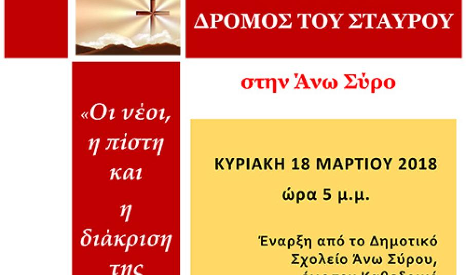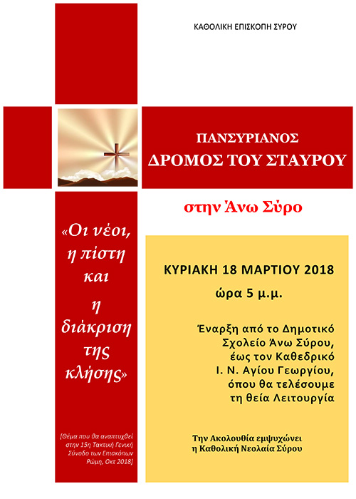 Την Κυριακή 18 Μαρτίου 2018 στις 5 μ.μ. ξεκινώντας κάτω από το Δημοτικό Σχολείο Άνω Σύρου, θα διατρέξουμε νοερά τον Δρόμο του Σταυρού του Κυρίου μας Ιησού Χριστού έως τον Καθεδρικό Ι. Ν. Αγίου Γεωργίου, όπου θα τελέσουμε τη θεία Λειτουργία.