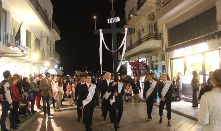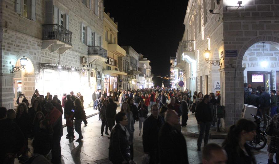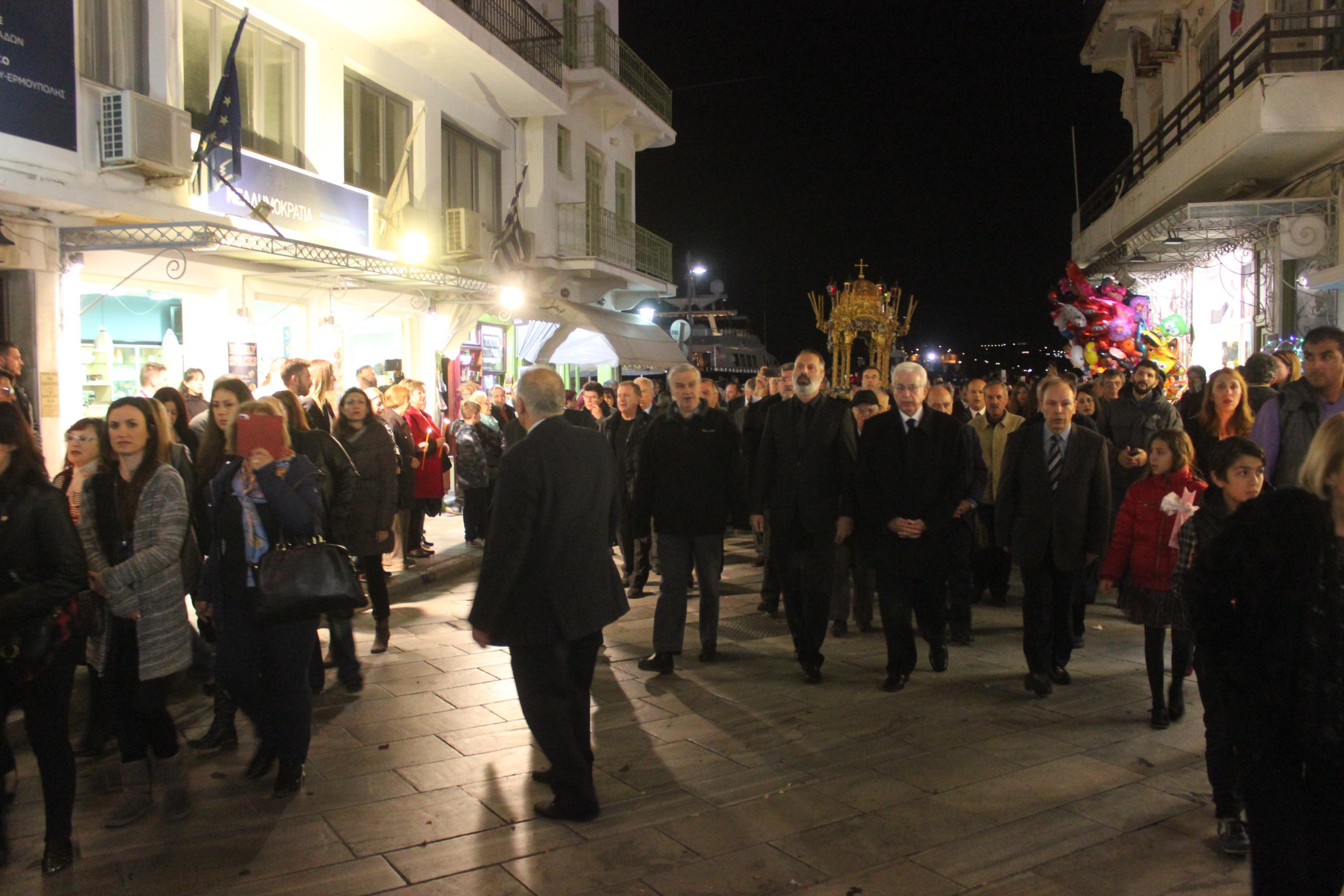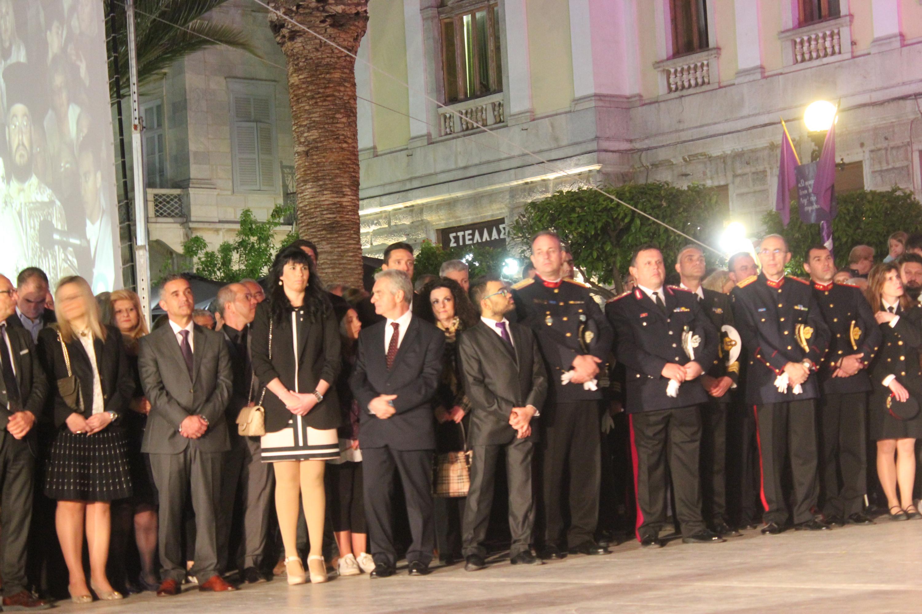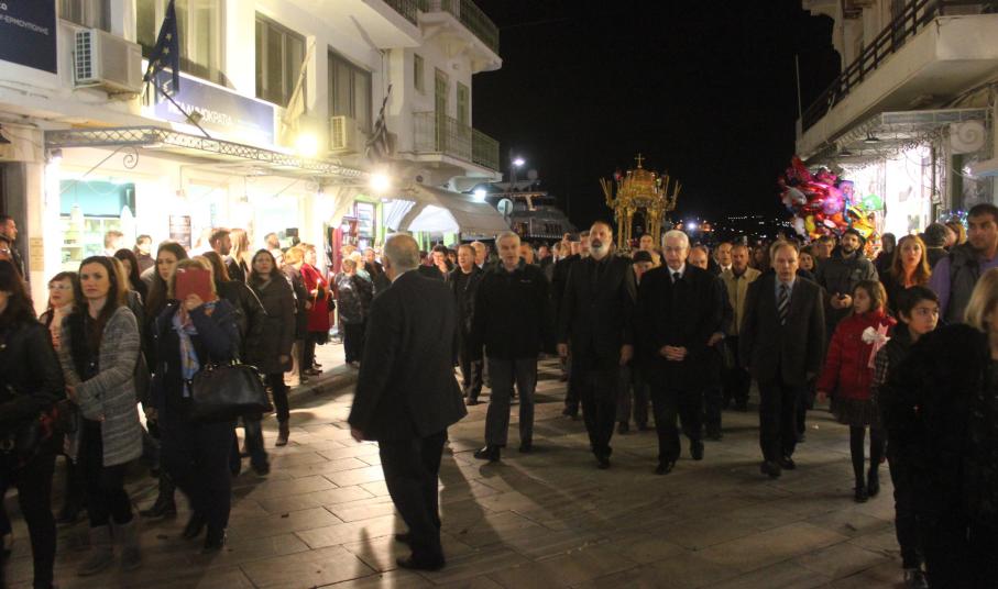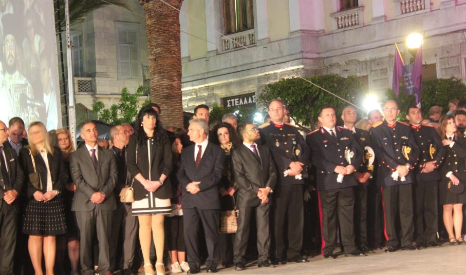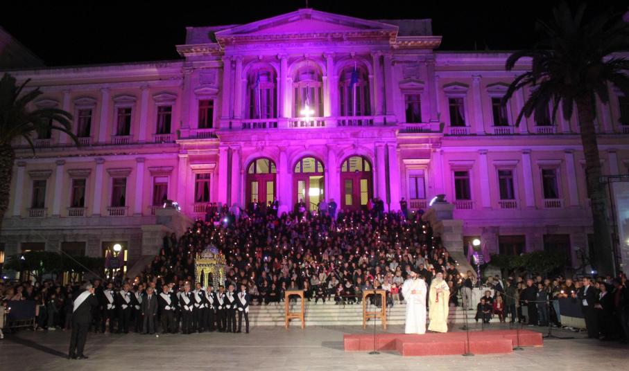 Έμπροσθεν του περίλαμπρου και εντυπωσιακά φωταγωγημένου Δημοτικού Μεγάρου, του «Παρθενώνα των Δημαρχείων της Ελλάδος», όπως το χαρακτήρισε, πραγματοποιήθηκε η κατά το έθος συνάντηση των επιταφίων των Επιταφίων των Ιερών Ναών Μεταμορφώσεως του Σωτήρως, Κοιμήσεως της Θεοτόκου και Αγίου Νικολάου, παρουσία της Γενικής Γραμματέως Αθλητισμού, του Βουλευτή Κυκλάδων Αντώνη Συρίγου, εκπροσώπων της τοπικής αυτοδιοίκησης, του στρατού και των σωμάτων ασφαλείας, δικαστικών λειτουργών και πλήθους πιστών.
