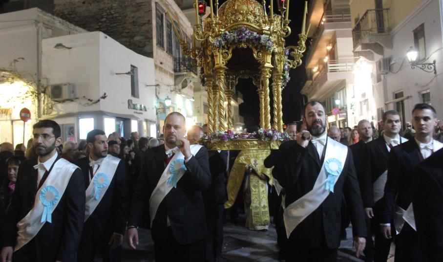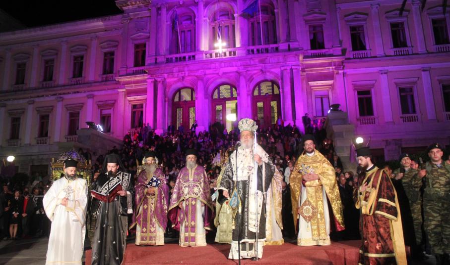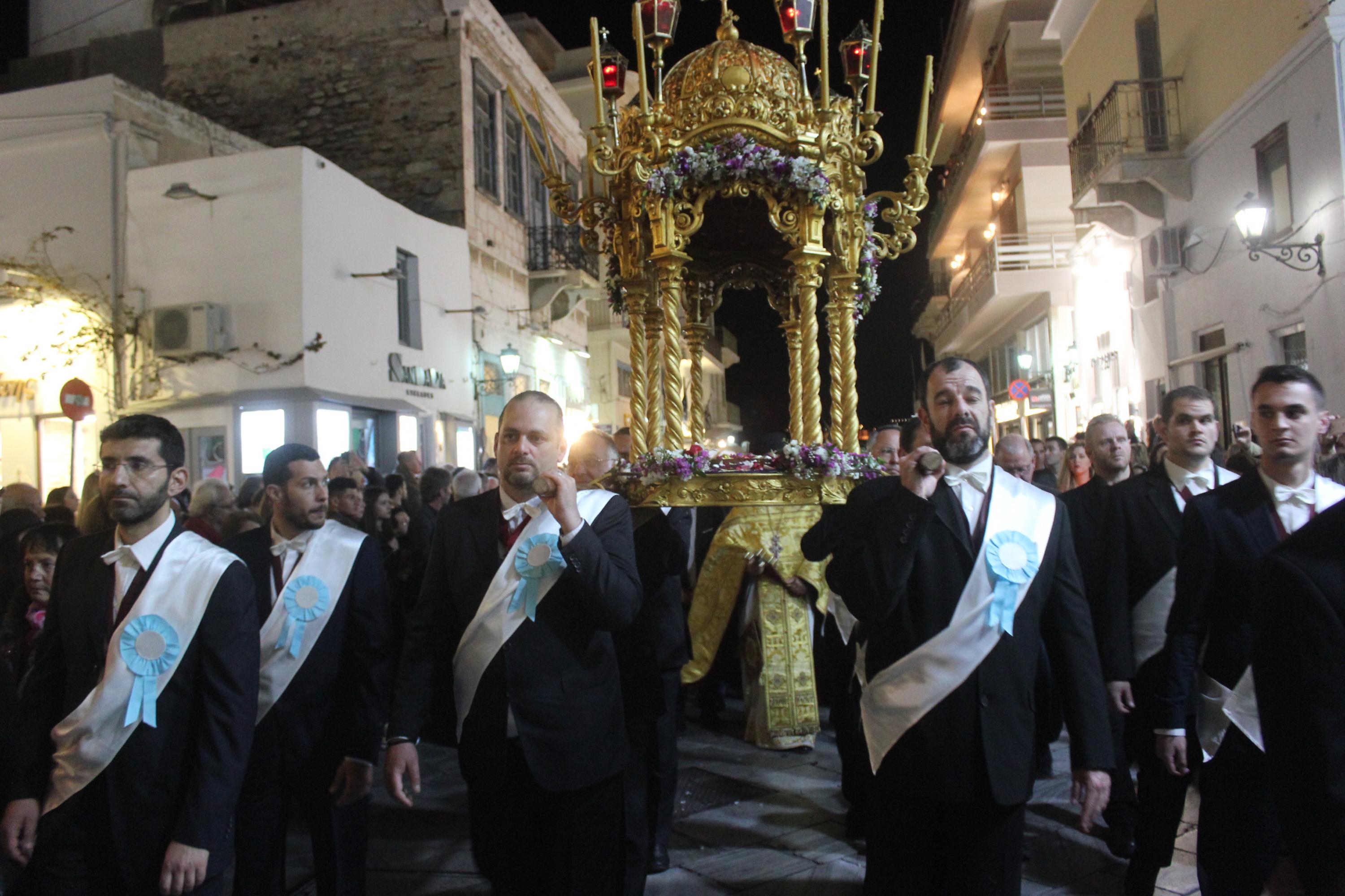 Το βράδυ της Μεγάλης Παρασκευής, ο Μητροπολίτης Σύρου προέστη της Ακολουθίας του Επιταφίου Θρήνου στον Ιερό Μητροπολιτικό Ναό της Μεταμορφώσεως του Σωτήρος και ακολούθως ετέθη επικεφαλής της λιτανευτικής πομπής του ιερού Επιταφίου προς την ιστορική Πλατεία Μιαούλη Ερμουπόλεως.