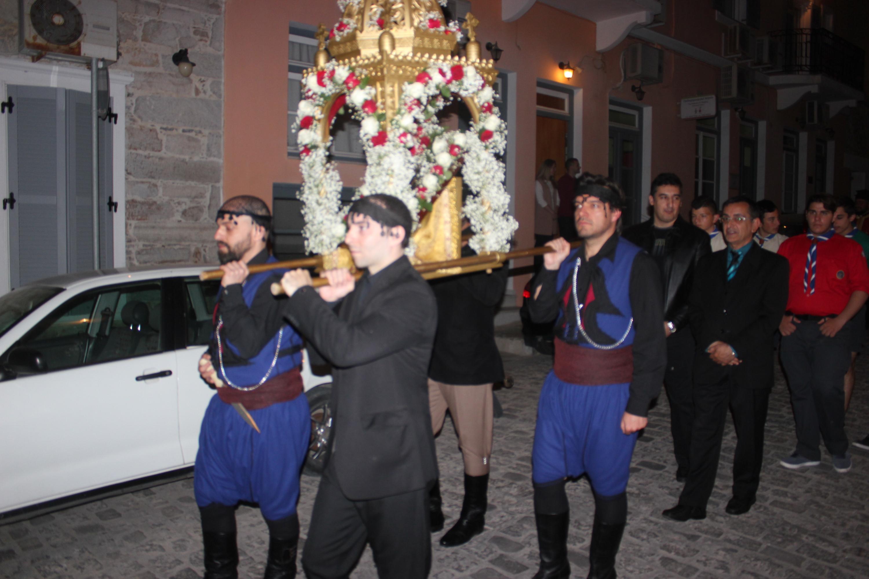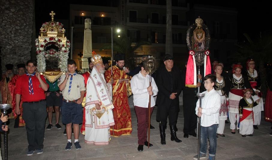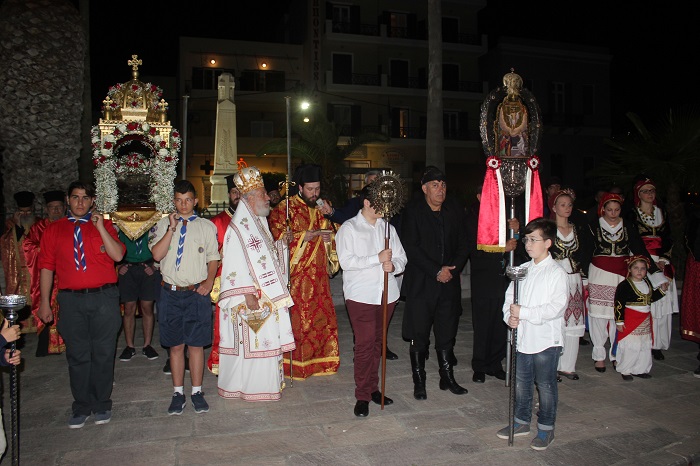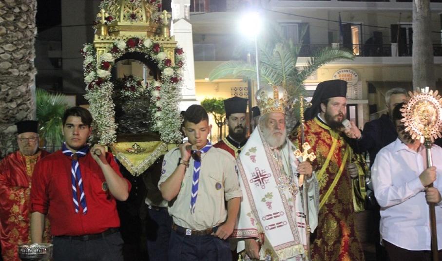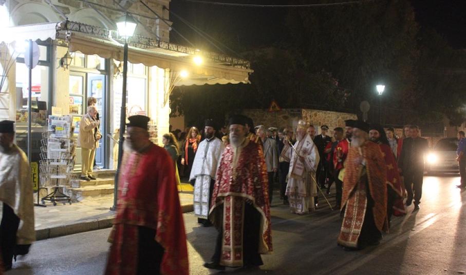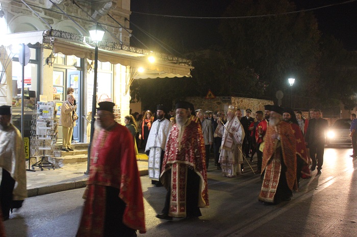Στον Εόρτιο Εσπερινό, ο οποίος τελέστηκε στον ομώνυμο Κοιμητηριακό Ναό στην Ερμούπολη χοροστάτησε ο Σεβασμιώτατος Μητροπολίτης Σύρου κ. Δωρόθεος Β’, ο οποίος στη συνέχεια προέστη της Λιτανεύσεως της Εφεστίου Εικόνος του Ναού.
