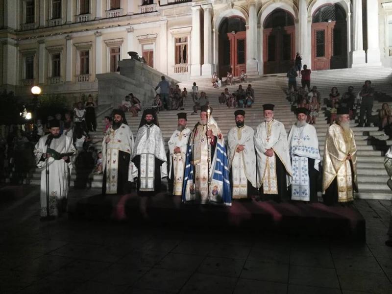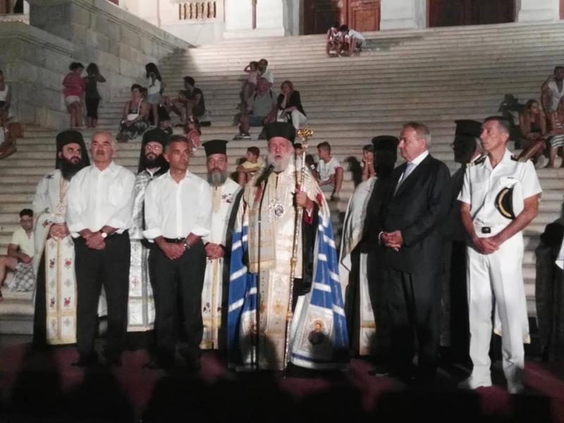 Παρουσία του Δημάρχου Σύρου – Ερμούπολης, Γιώργου Μαραγκού, δημοτικών και περιφερειακών συμβούλων, του Εισαγγελέως και Αντεισαγγελέως Εφετών Αιγαίου, του Λιμενάρχη Σύρου, εκπροσώπου του Διοικητή της 6ης Περιφέρειας Λιμενικού Σώματος και πλήθους πιστών, ο Σεβασμιώτατος κ. Δωρόθεος ανέπεμψε Δέηση υπέρ των αιφνιδίως των θυμάτων και των πληγέντων από τις καταστροφικές πυρκαγιές στην Ανατολική Αττική.