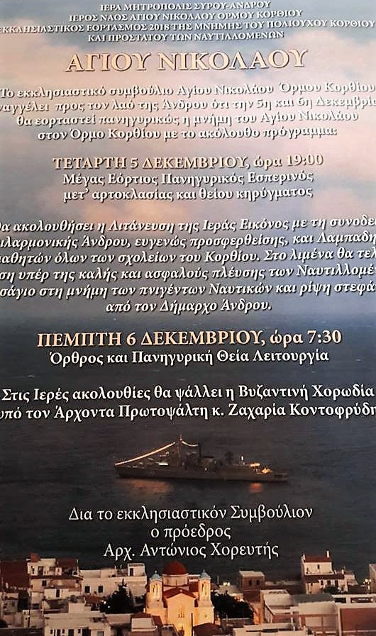 Το Εκκλησιαστικό Συμβούλιο του Αγίου Νικολάου Όρμου Κορθίου αναγγέλλει προς τον λαό της Άνδρου ότι την 5η και 6η Δεκεμβρίου θα εορταστεί πανηγυρικώς η μνήμη του Αγίου Νικολάου στον Όρμο Κορθίου με το ακόλουθο πρόγραμμα: