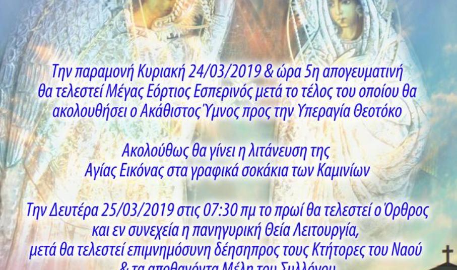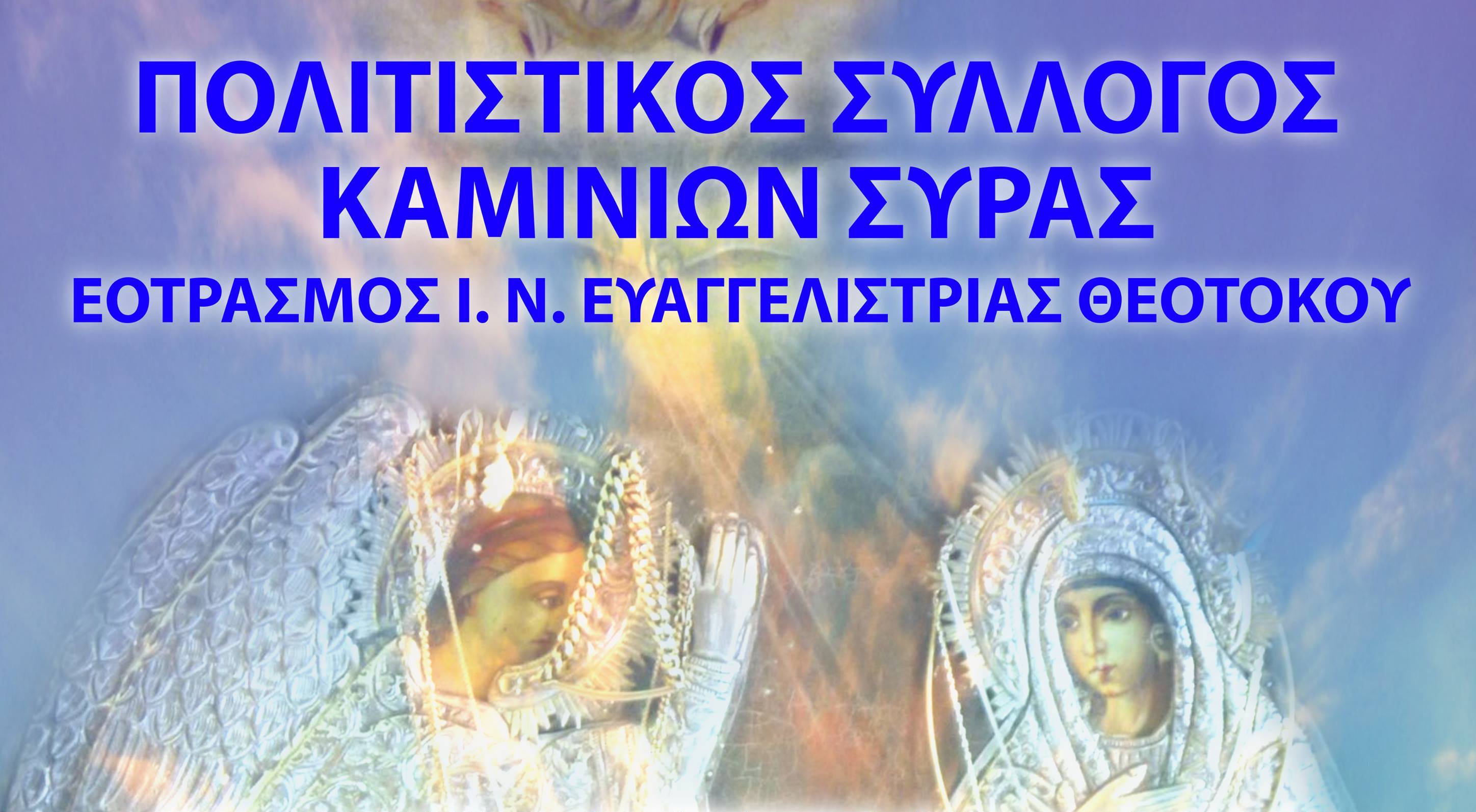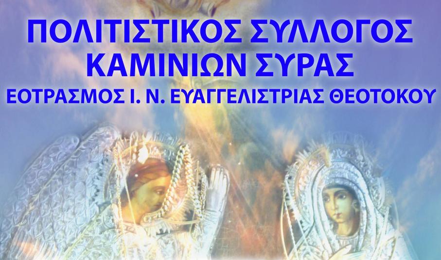 Στους εκκλησιαστικούς εορτασμούς για τη μεγάλη γιορτή τους Ευαγγελισμού της Θεοτόκου καλεί ο Πολιτιστικός και Μορφωτικός Σύλλογος Καμινίων, στις 24 Μαρτίου, στον Ι.Ν. Ευαγγελίστριας Θεοτόκου.