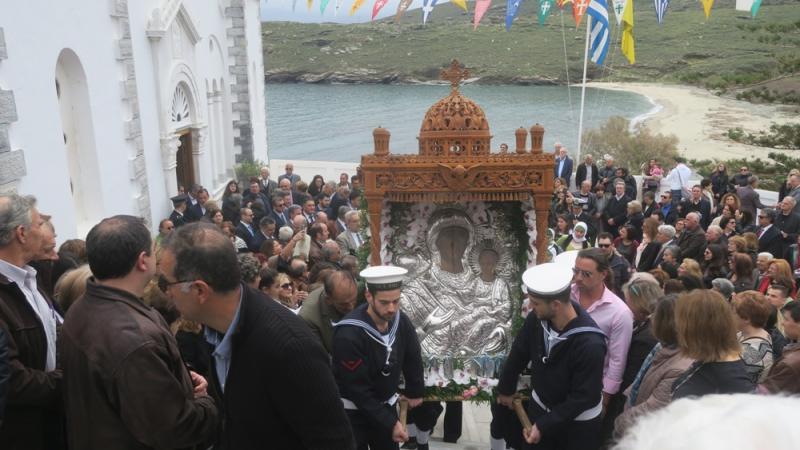 Ακολούθησε πάνδημος λιτανεία της Αγίας Εικόνας, πλαισιωμένη από τις Φιλαρμονικές του Δήμου Κορίνθου, του Μουσικού Συλλόγου Άνδρου, νέους και νέες με παραδοσιακές ενδυμασίες, μαθητές του Ναυτικού Λυκείου Άνδρου, άγημα του Ναυτικού Παρατηρητηρίου Αμμολόχου και από τη Φρεγάτα « Κουντουριώτης», η οποία από χθες έχει αγκυροβολήσει προ του φάρου «Τουρλίτη».