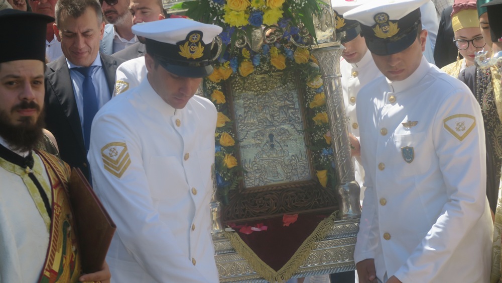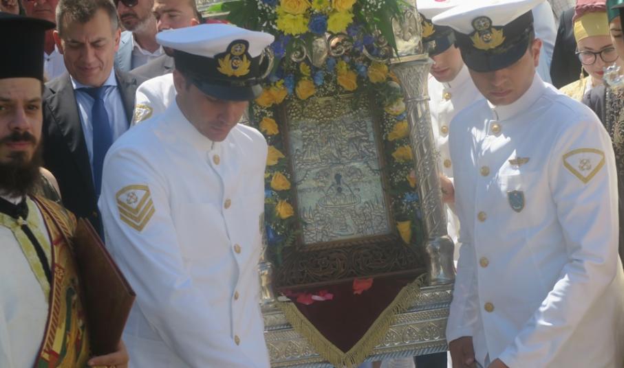 Μετά την αποβίβασή της, δια χειρών του Πανηγυρά, η ιερά Εικόνα μετεφέρθη στον Ιερό Ναό υπό τους παιάνες της Φιλαρμονικής του Λιμενικού Σώματος, διά χειρών του Σεβασμιωτάτου Μητροπολίτου Μεσογαίας κ. Νικολάου, ο οποίος προεξήρχε του Πολυαρχιερατικού Εσπερινού, ο οποίος ακολούθησε.