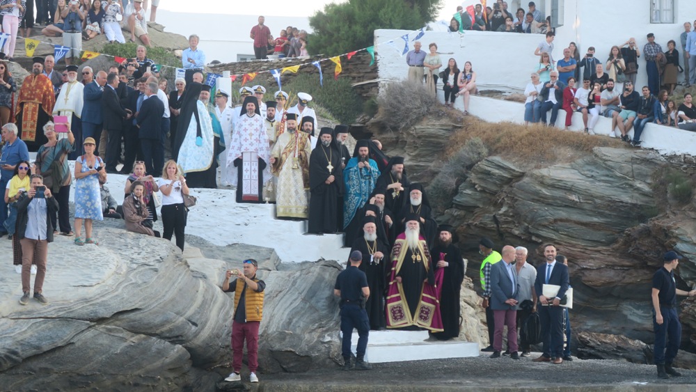 Μετά την άφιξή του στο λιμάνι των Καμαρών Σίφνου, απ’ όπου παρέλαβε κατά το έθος την ιερά Εικόνα της Παναγίας Χρυσοπηγής, το πλοίο Speed Runner περιέπλευσε τη Σίφνο και προσορμίσθηκε έναντι του ιερού Βράχου της Χρυσοπηγής, επί του οποίου ανέμεναν την αγία Εικόνα οι Σεβασμιώτατοι Μητροπολίτες Χαλκίδος κ. Χρυσόστομος, Μεσογαίας και Λαυρεωτικής κ. Νικόλαος, Ιλίου κ. Αθηναγόρας, Ιερισσού κ. Θεόκλητος, Τρίκκης κ. Χρυσόστομος και Σύρου κ. Δωρόθεος Β’, επικεφαλής εκατοντάδων προσκυνητών από τη Σίφνο και τα πέριξ νησιά.