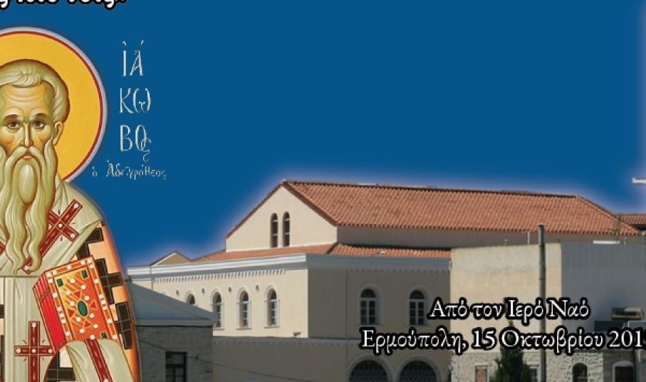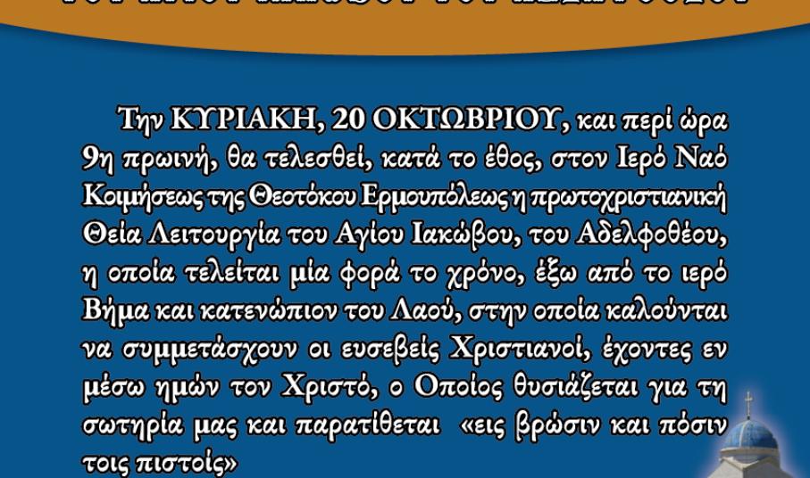 Την Κυριακή 20 Οκτωβρίου και περί ώρα 9η πρωινή, θα τελεσθεί, κατά το έθος, στον Ιερό Ναό Κοιμήσεως της Θεοτόκου Ερμουπόλεως η πρωτοχριστιανική Θεία Λειτουργία του Αγίου Ιακώβου η οποία τελείται μια φορά το χρόνο, έξω από το ιερό Βήμα και κατενώπιον του Λαού.