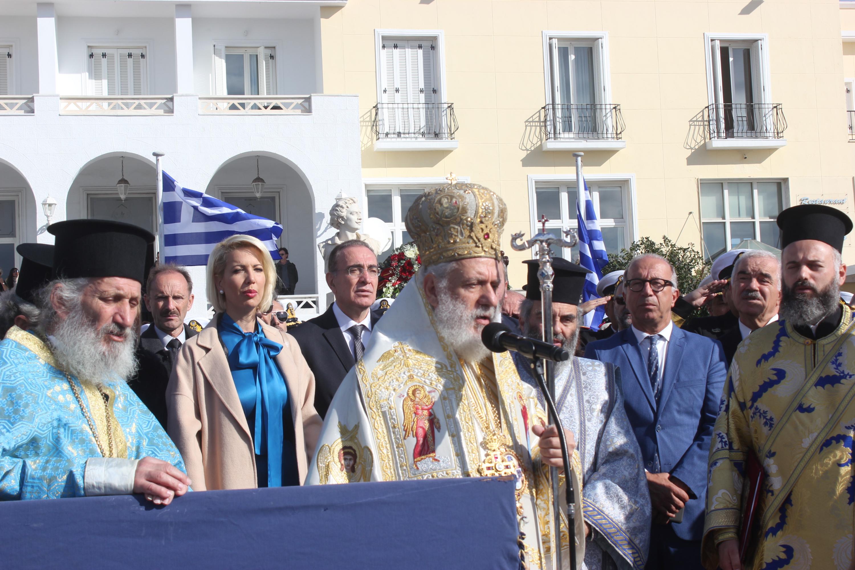 Αναφέρθηκε επίσης στις ημέρες χαρές που πρόσφατα έζησε το νησί με τη μεταβίβαση του Ναυπηγείου Νεωρίου στην «ΟΝΕΧ» και την επαναλειτουργία του, υπογραμμίζοντας ότι, η Σύρος μπορεί να αποτελέσει φωτεινό παράδειγμα για την ανάπτυξη και την ευημερία του λαού και σε άλλες περιοχές της Ελλάδας. Πρόσθεσε μάλιστα πως αυτές οι ευτυχείς εξελίξεις είναι αποτέλεσμα συνέργειας όλων των δυνάμεων που λειτούργησαν, κυριευμένες από αίσθημα ευθύνης απέναντι στην ένδοξη ιστορία του τόπου και τις μνήμες των πατέρων μας.