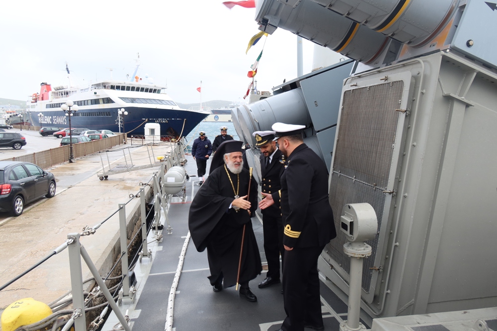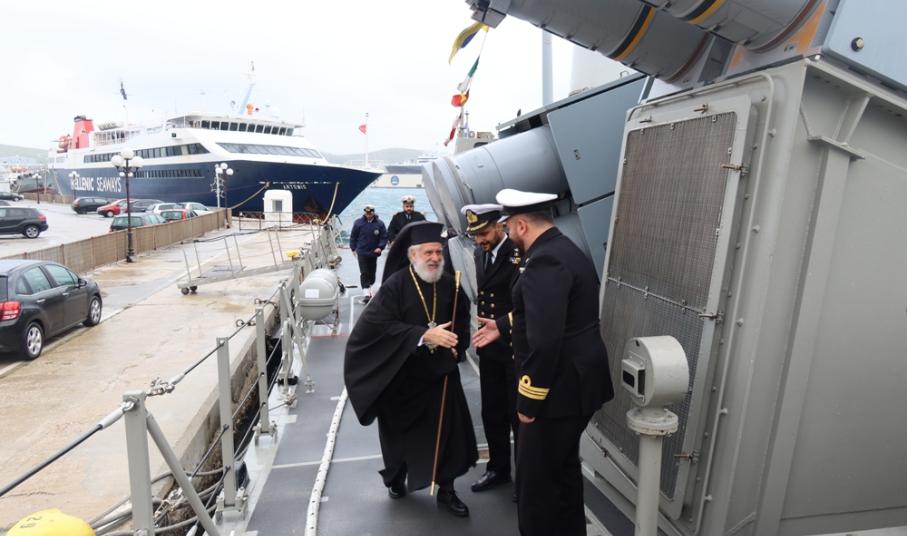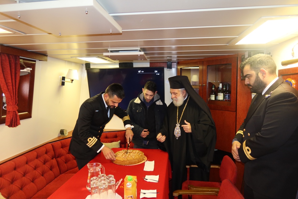 Μετά τον Αγιασμό των Υδάτων στο λιμάνι της Ερμούπολης, ο Σεβασμιώτατος κ. Δωρόθεος Β’ επεσκέφθη την προσορμισμένη, προς απόδοση τιμών, κατόπιν σχετικής εντολής του Ενδοξοτάτου Αρχηγού του ΓΕΝ Αντιναυάρχου κ. Νικ. Τσουνή, ανταποκριθέντος σε σχετικό αίτημά του, ΤΠΚ « ΡΙΤΣΟΣ», όπου ευλόγησε την Αγιοβασιλειόπιττα, ευχήθηκε υγεία, καλούς και ειρηνικούς πλόες στον Κυβερνήτη και το Πλήρωμά της και τους κάλεσε να μιμηθούν τους μεγάλους Ναυμάχους του Γένους, Ανδρέα Μιαούλη, Κωνστ. Κανάρη και Παύλου Κουντουριώτης.