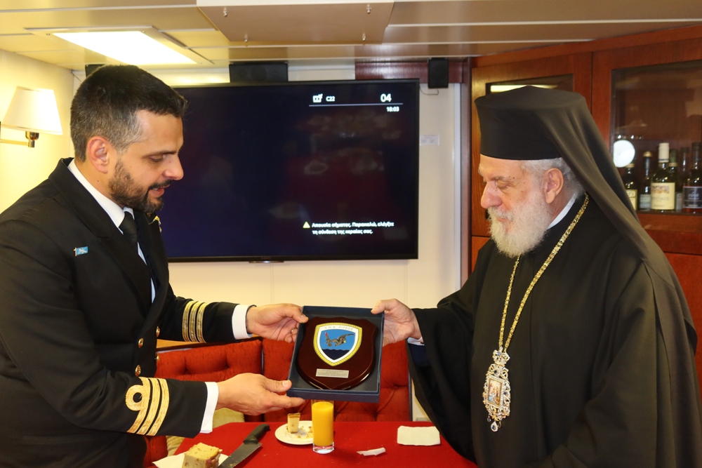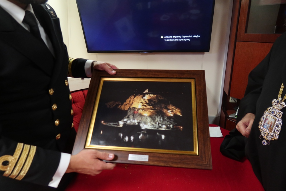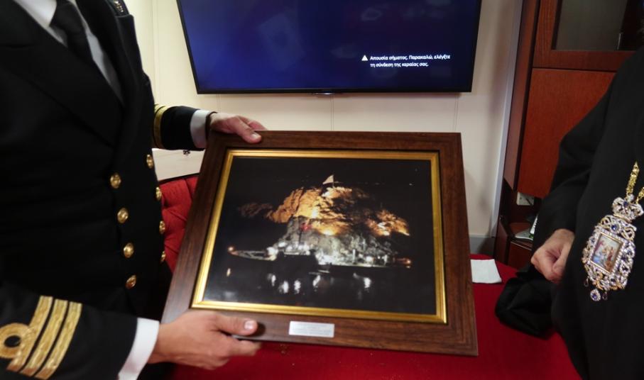 Προσέφερε επίσης αντίγραφο της Εικόνος της Μεγαλόχαρης στον Κυβερνήτη και, δι’ αυτού, αντίγραφο της Εικόνος του Αγίου Νικολάου στον Ενδοξότατο Αρχηγό του ΓΕΝ, μαζί με τις ευχές και τις ευχαριστίες του.