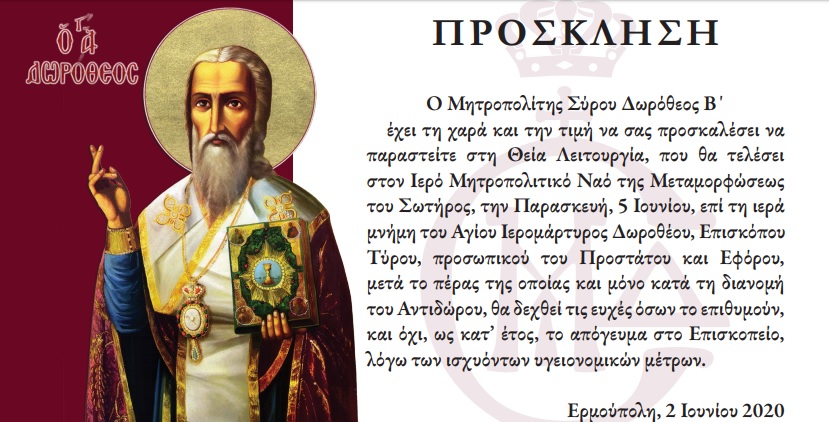 Ο Μητροπολίτης Σύρου Δωρόθεος Β΄ έχει τη χαρά και την τιμή να σας προσκαλέσει να παραστείτε στη Θεία Λειτουργία, που θα τελέσει στον Ιερό Μητροπολιτικό Ναό της Μεταμορφώσεως του Σωτήρος, την Παρασκευή, 5 Ιουνίου, επί τη ιερά μνήμη του Αγίου Ιερομάρτυρος Δωροθέου, Επισκόπου Τύρου, προσωπικού του Προστάτου και Εφόρου, μετά το πέρας της οποίας και μόνο κατά τη διανομή του Αντιδώρου, θα δεχθεί τις ευχές όσων το επιθυμούν, και όχι, ως κατ’ έτος, το απόγευμα στο Επισκοπείο, λόγω των ισχυόντων υγειονομικών μέτρων.